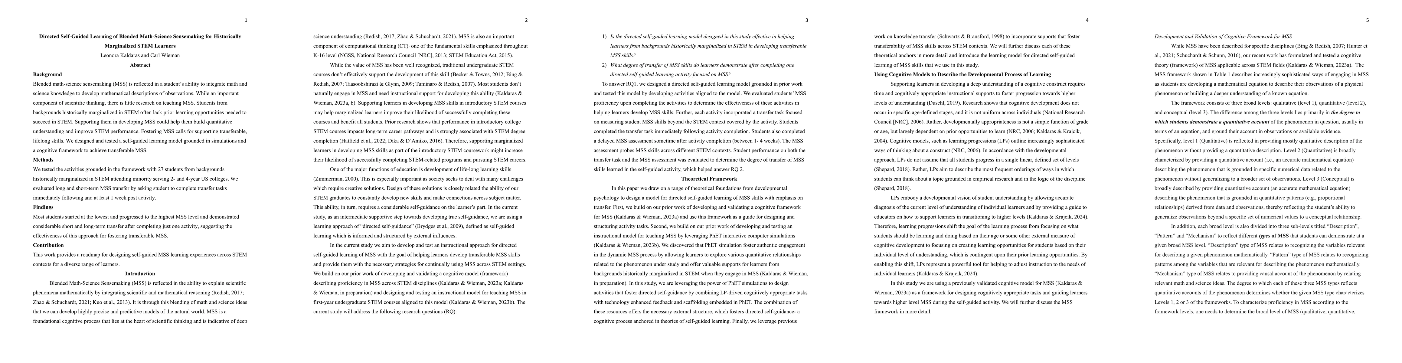This study developed and tested a self-guided learning model to enhance blended math-science sensemaking (MSS) among historically marginalized STEM learners. Results showed significant short and long-term MSS transfer after one activity, indicating the model's effectiveness in fostering transferable skills.