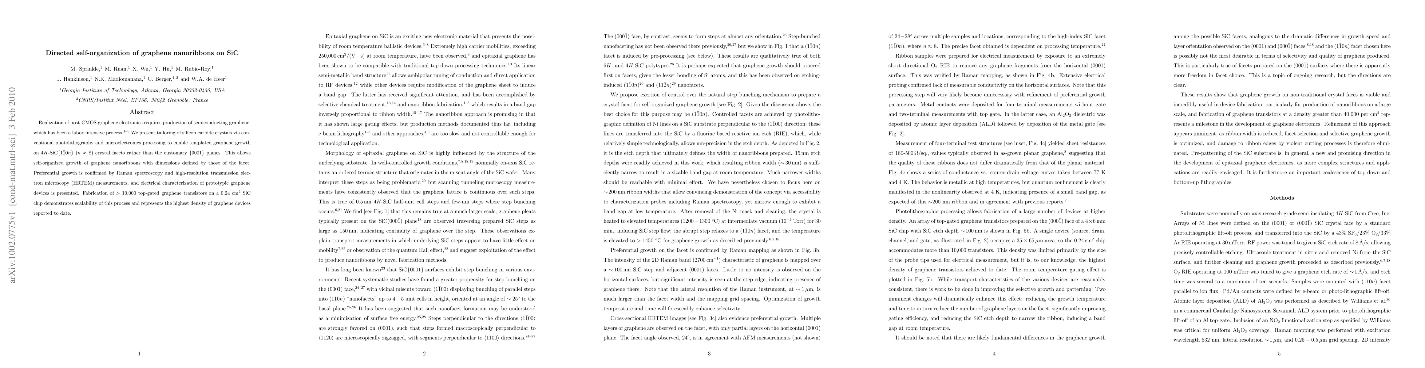 Realization of post-CMOS graphene electronics requires production of semiconducting graphene, which has been a labor-intensive process. We present tailoring of silicon carbide crystals via conventional photolithography and microelectronics processing to enable templated graphene growth on 4H-SiC{1-10n} (n = 8) crystal facets rather than the customary {0001} planes. This allows self-organized growth of graphene nanoribbons with dimensions defined by those of the facet. Preferential growth is confirmed by Raman spectroscopy and high-resolution transmission electron microscopy (HRTEM) measurements, and electrical characterization of prototypic graphene devices is presented. Fabrication of > 10,000 top-gated graphene transistors on a 0.24 cm2 SiC chip demonstrates scalability of this process and represents the highest density of graphene devices reported to date.