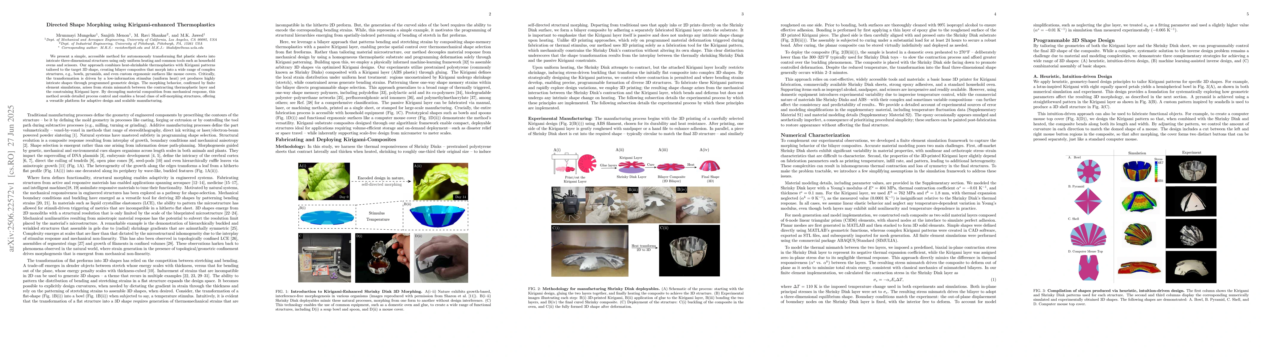 The research presents a method for autonomously transforming flat plastic sheets into intricate 3D structures using uniform heating and common tools like household ovens and scissors. It combines heat-shrinkable thermoplastics with Kirigami patterns tailored to the target 3D shape, creating bilayer composites that morph into complex structures.