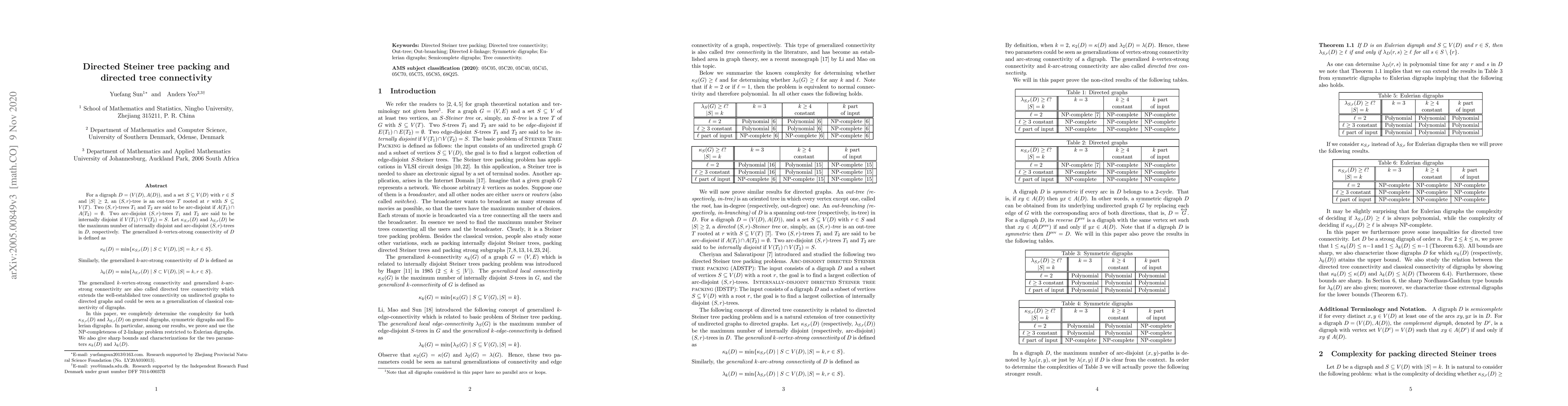 The paper determines the complexity of two key parameters in directed graph connectivity: vertex-strong connectivity (λ_k) and arc-strong connectivity (Ӈ_k), with results for general digraphs, symmetric digraphs, and Eulerian digraphs.