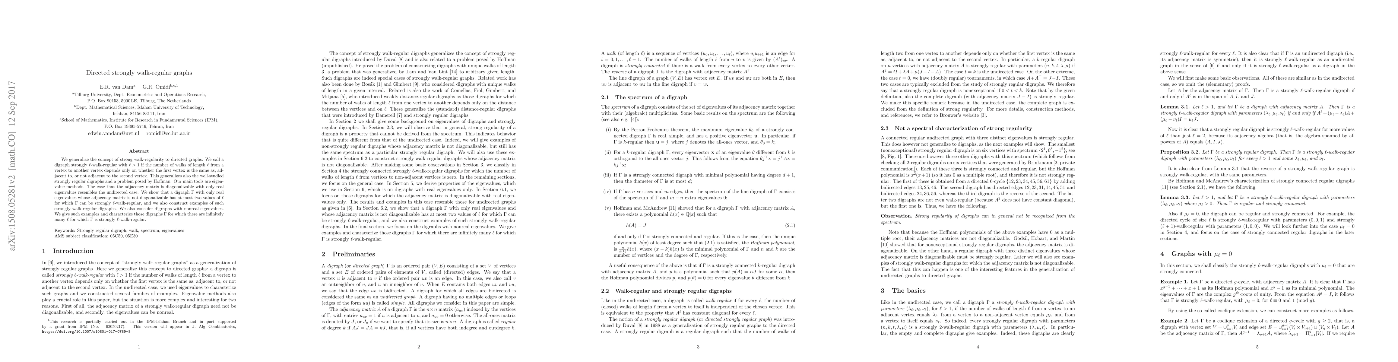 This paper extends the notion of strong walk-regularity to directed graphs, demonstrating that such digraphs can be characterized by the number of walks of varying lengths between vertices, and employs eigenvalue methods to analyze their properties. It identifies conditions under which digraphs exhibit strong $\ell$-walk-regularity, particularly when their adjacency matrices have real or nonreal eigenvalues.