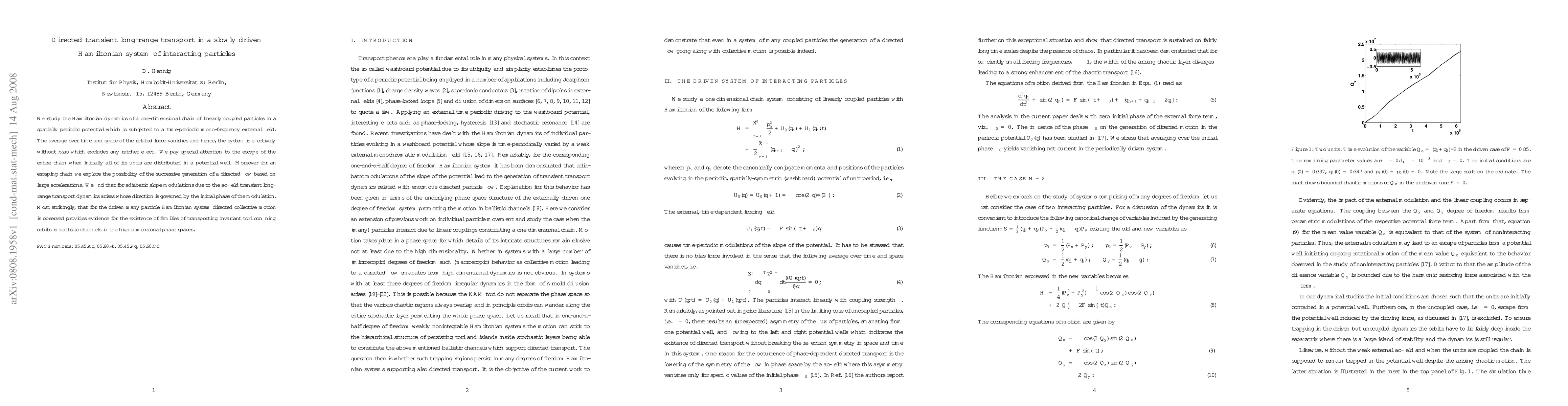 This paper investigates Hamiltonian dynamics in a one-dimensional chain of coupled particles in a periodic potential driven by an ac-field, finding transient long-range transport and directed collective motion governed by modulation phase, revealing invariant tori in the phase space.