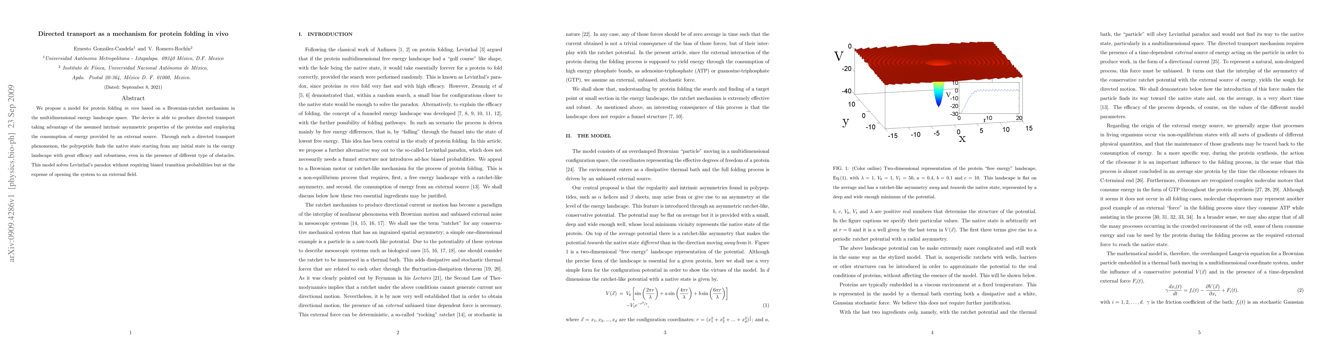 We propose a model for protein folding in vivo based on a Brownian-ratchet mechanism in the multidimensional energy landscape space. The device is able to produce directed transport taking advantage of the assumed intrinsic asymmetric properties of the proteins and employing the consumption of energy provided by an external source. Through such a directed transport phenomenon, the polypeptide finds the native state starting from any initial state in the energy landscape with great efficacy and robustness, even in the presence of different type of obstacles. This model solves Levinthal's paradox without requiring biased transition probabilities but at the expense of opening the system to an external field.