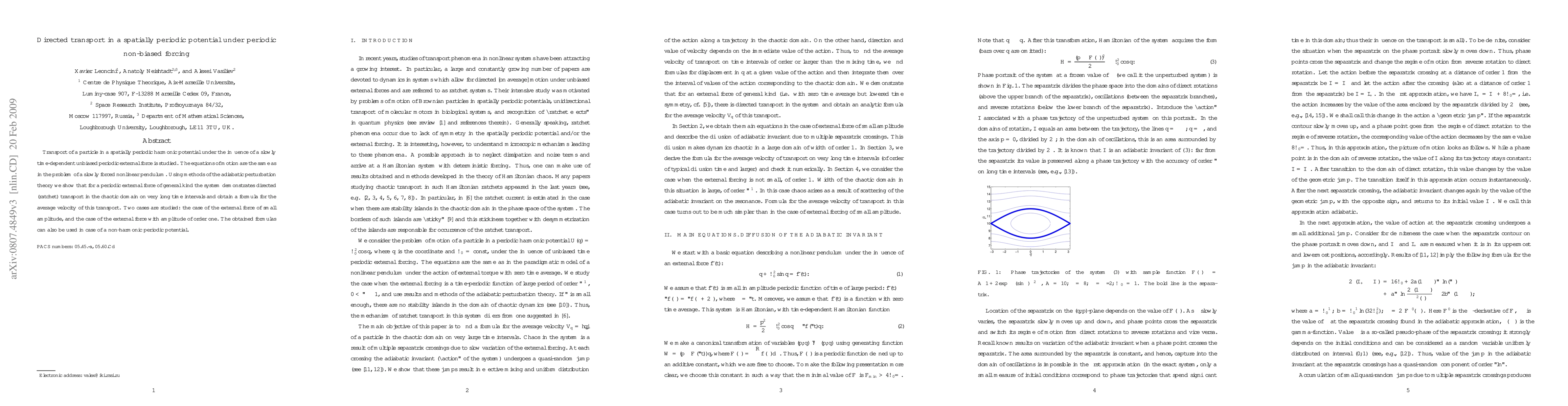 This paper investigates directed transport in a spatially periodic potential under periodic, non-biased forcing, demonstrating that the system exhibits ratchet transport in the chaotic domain over long time intervals. The study uses adiabatic perturbation theory to derive an average velocity formula for transport, applicable to both small and large amplitude external forces, and extends to non-harmonic periodic potentials.