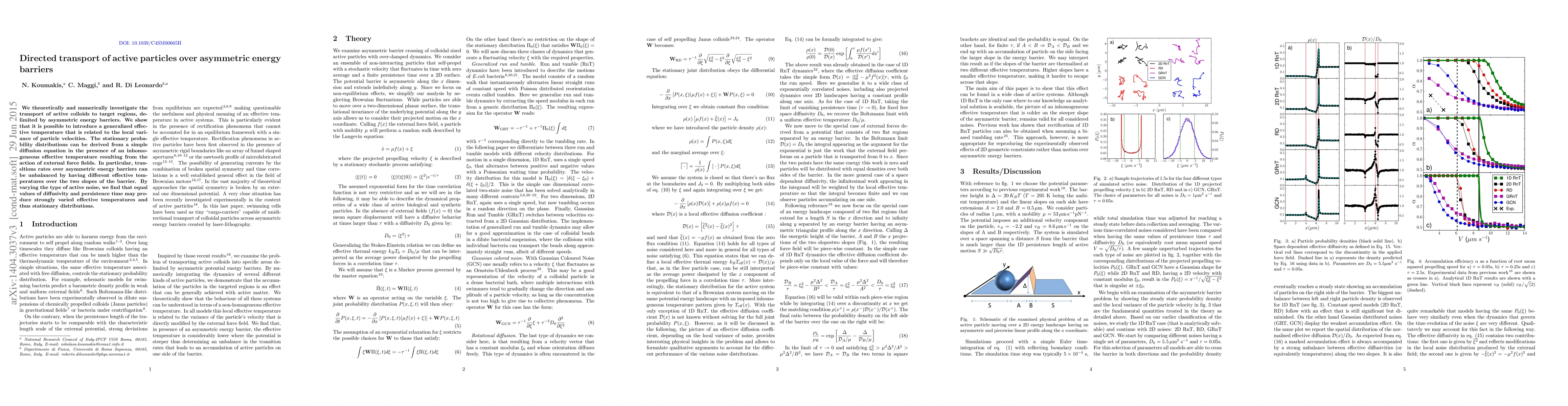 We theoretically and numerically investigate the transport of active colloids to target regions, delimited by asymmetric energy barriers. We show that it is possible to introduce a generalized effective temperature that is related to the local variance of particle velocities. The stationary probability distributions can be derived from a simple diffusion equation in the presence of an inhomogeneous effective temperature resulting from the action of external force fields. In particular, transitions rates over asymmetric energy barriers can be unbalanced by having different effective temperatures over the two slopes of the barrier. By varying the type of active noise, we find that equal values of diffusivity and persistence time may produce strongly varied effective temperatures and thus stationary distributions.