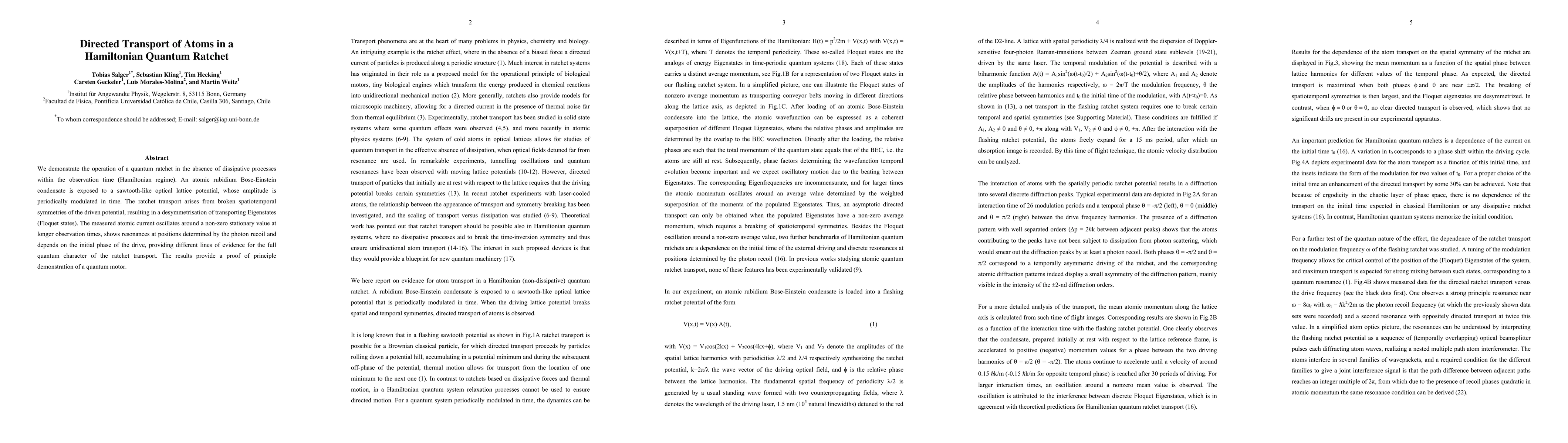 We demonstrate the operation of a quantum ratchet in the absence of dissipative processes within the observation time (Hamiltonian regime). An atomic rubidium Bose-Einstein condensate is exposed to a sawtooth-like optical lattice potential, whose amplitude is periodically modulated in time. The ratchet transport arises from broken spatiotemporal symmetries of the driven potential, resulting in a desymmetrisation of transporting Eigenstates (Floquet states). The measured atomic current oscillates around a non-zero stationary value at longer observation times, shows resonances at positions determined by the photon recoil and depends on the initial phase of the drive, providing different lines of evidence for the full quantum character of the ratchet transport. The results provide a proof of principle demonstration of a quantum motor.