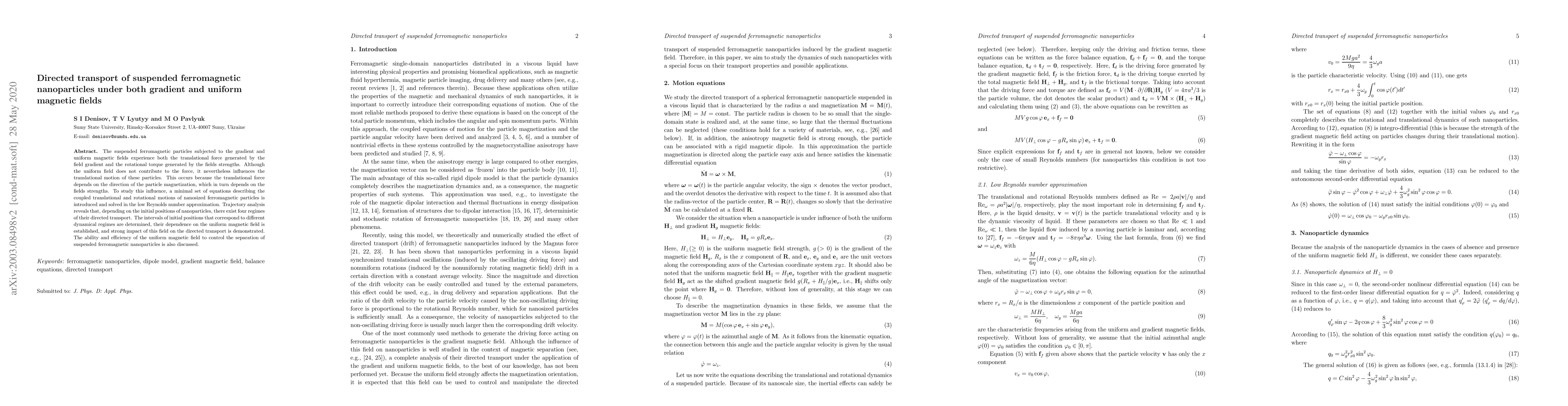 Researchers discovered that suspended ferromagnetic nanoparticles can be directed to move under both gradient and uniform magnetic fields, with the latter influencing their translational motion despite not contributing a force. Four regimes of movement were identified, dependent on initial positions, which highlights the potential for controlling particle separation using uniform magnetic fields.