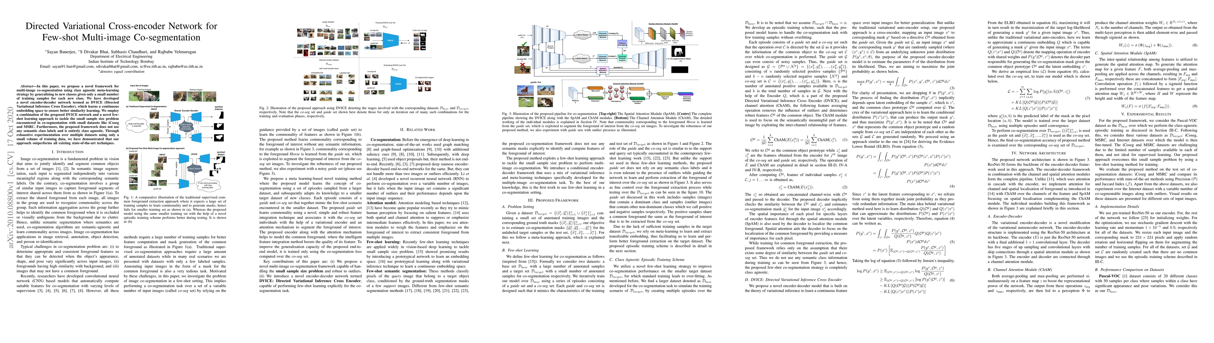 This paper introduces a novel framework for multi-image co-segmentation using a class agnostic meta-learning strategy with few-shot learning. The proposed DVICE network enhances similarity learning in a continuous embedding space, achieving superior performance over existing methods with minimal training data.