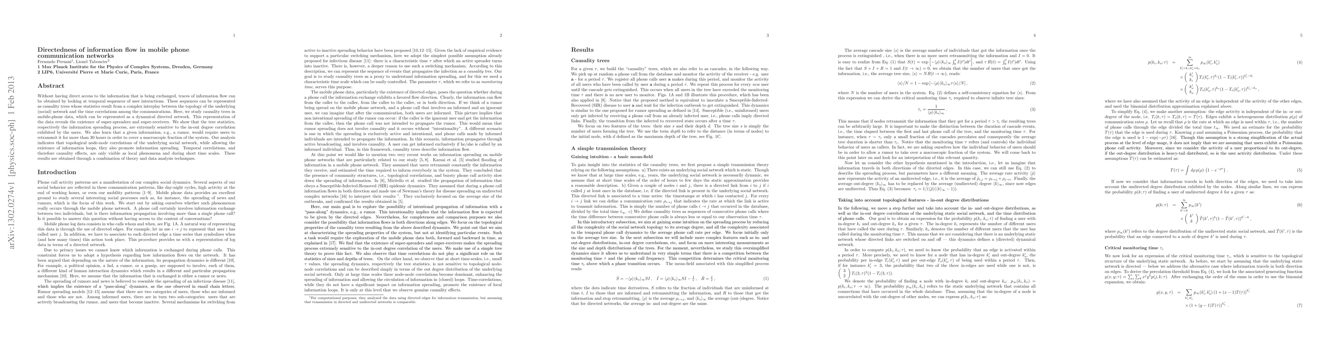 Without having direct access to the information that is being exchanged, traces of information flow can be obtained by looking at temporal sequences of user interactions. These sequences can be represented as causality trees whose statistics result from a complex interplay between the topology of the underlying (social) network and the time correlations among the communications. Here, we study causality trees in mobile-phone data, which can be represented as a dynamical directed network. This representation of the data reveals the existence of super-spreaders and super-receivers. We show that the tree statistics, respectively the information spreading process, are extremely sensitive to the in-out degree correlation exhibited by the users. We also learn that a given information, e.g., a rumor, would require users to retransmit it for more than 30 hours in order to cover a macroscopic fraction of the system. Our analysis indicates that topological node-node correlations of the underlying social network, while allowing the existence of information loops, they also promote information spreading. Temporal correlations, and therefore causality effects, are only visible as local phenomena and during short time scales. These results are obtained through a combination of theory and data analysis techniques.