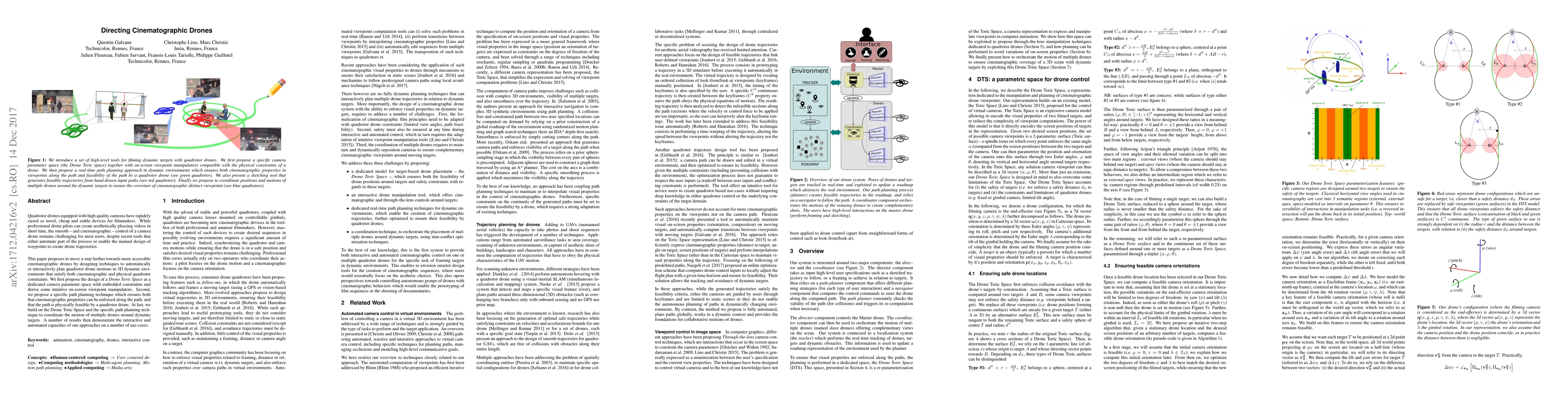 Quadrotor drones equipped with high quality cameras have rapidely raised as novel, cheap and stable devices for filmmakers. While professional drone pilots can create aesthetically pleasing videos in short time, the smooth -- and cinematographic -- control of a camera drone remains challenging for most users, despite recent tools that either automate part of the process or enable the manual design of waypoints to create drone trajectories. This paper proposes to move a step further towards more accessible cinematographic drones by designing techniques to automatically or interactively plan quadrotor drone motions in 3D dynamic environments that satisfy both cinematographic and physical quadrotor constraints. We first propose the design of a Drone Toric Space as a dedicated camera parameter space with embedded constraints and derive some intuitive on-screen viewpoint manipulators. Second, we propose a specific path planning technique which ensures both that cinematographic properties can be enforced along the path, and that the path is physically feasible by a quadrotor drone. At last, we build on the Drone Toric Space and the specific path planning technique to coordinate the motion of multiple drones around dynamic targets. A number of results then demonstrate the interactive and automated capacities of our approaches on a number of use-cases.