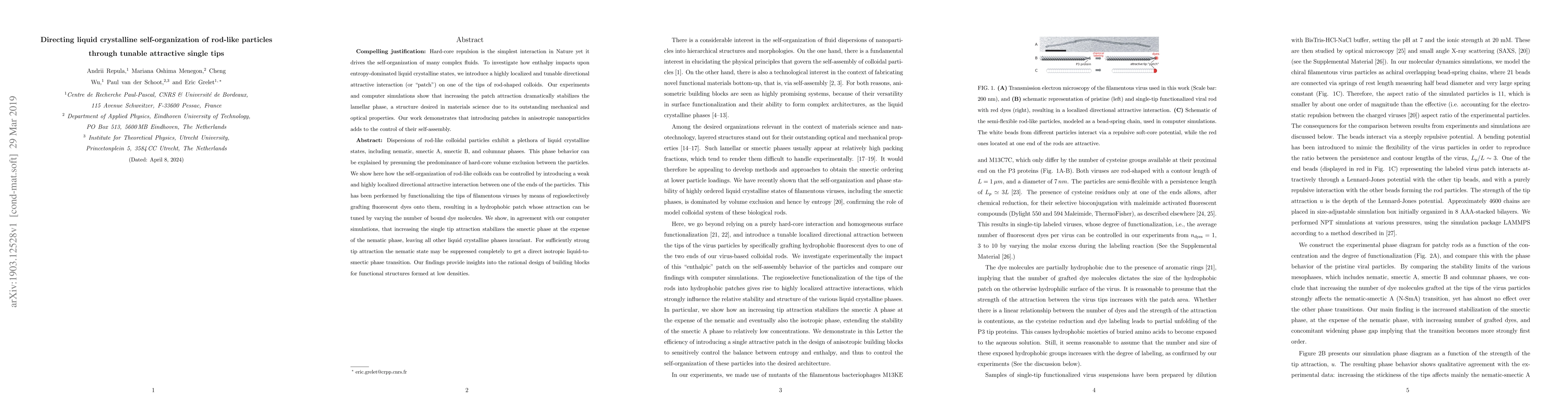 This paper demonstrates how introducing a tunable attractive interaction at one end of rodlike colloidal particles can direct their self-organization into specific liquid crystalline phases, notably stabilizing the smectic phase and potentially suppressing the nematic phase entirely. The study uses filamentous viruses functionalized with dye molecules to achieve this localized attraction.