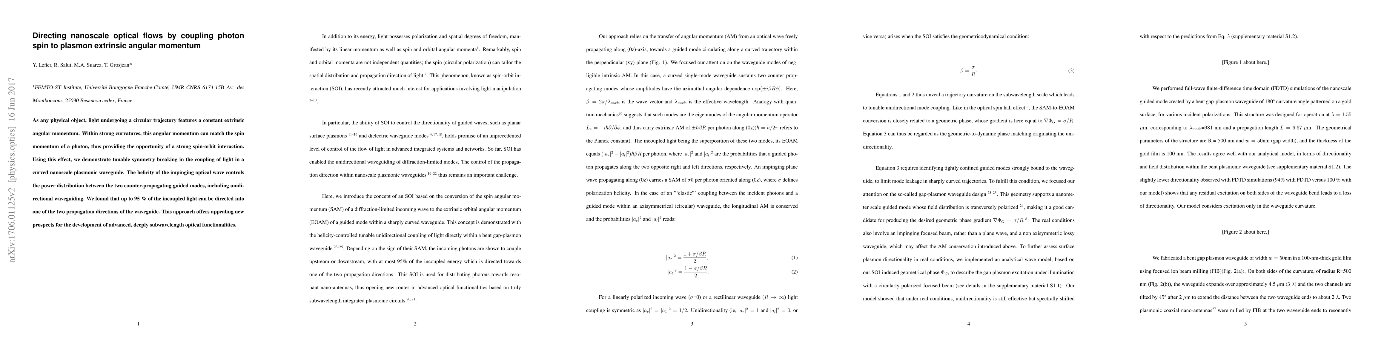This paper demonstrates a method to control nanoscale optical flows by coupling photon spin to plasmonic extrinsic angular momentum, enabling tunable symmetry breaking and unidirectional waveguiding in curved plasmonic waveguides, with up to 95% of light directed into one propagation direction. This technique holds promise for advanced subwavelength optical functionalities.