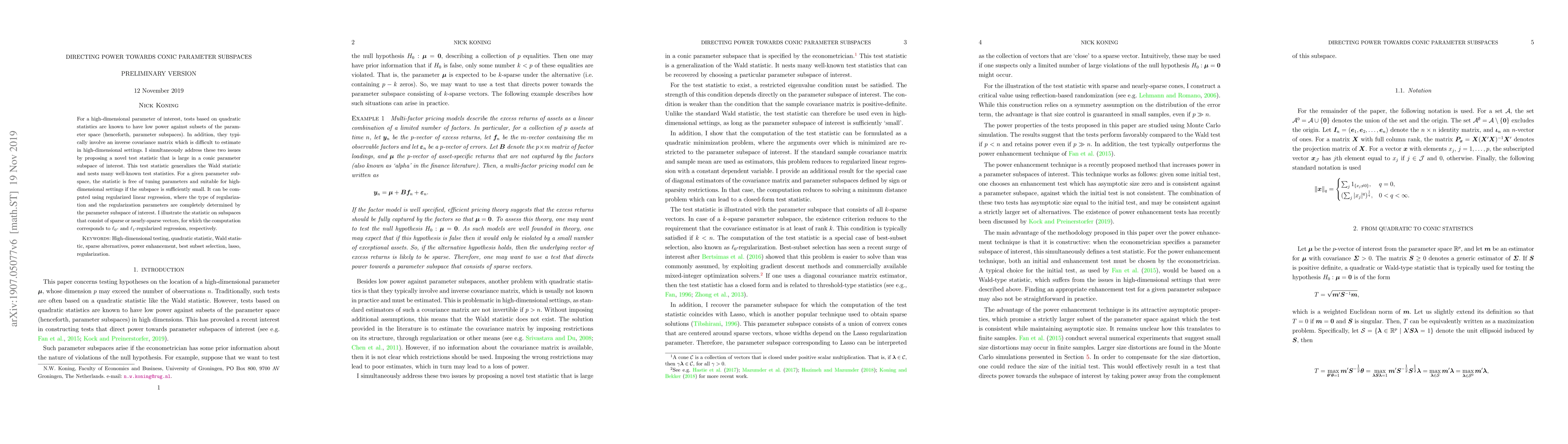 For a high-dimensional parameter of interest, tests based on quadratic statistics are known to have low power against subsets of the parameter space (henceforth, parameter subspaces). In addition, they typically involve an inverse covariance matrix which is difficult to estimate in high-dimensional settings. I simultaneously address these two issues by proposing a novel test statistic that is large in a conic parameter subspace of interest. This test statistic generalizes the Wald statistic and nests many well-known test statistics. For a given parameter subspace, the statistic is free of tuning parameters and suitable for high-dimensional settings if the subspace is sufficiently small. It can be computed using regularized linear regression, where the type of regularization and the regularization parameters are completely determined by the parameter subspace of interest. I illustrate the statistic on subspaces that consist of sparse or nearly-sparse vectors, for which the computation corresponds to $\ell_0$- and $\ell_1$-regularized regression, respectively.
