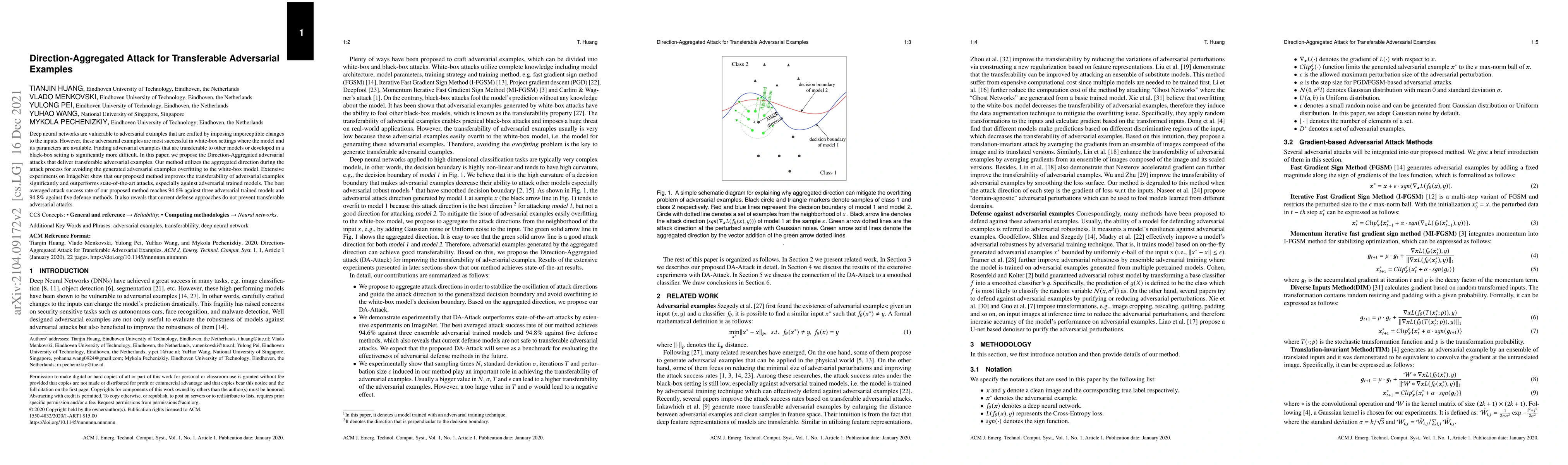 This paper proposes a Direction-Aggregated attack method to create transferable adversarial examples that work across different models, even in black-box settings. The method significantly improves transferability and outperforms existing attacks, achieving 94.6% success against three adversarially trained models and 94.8% against five defense methods, highlighting the insufficiency of current defenses against such attacks.