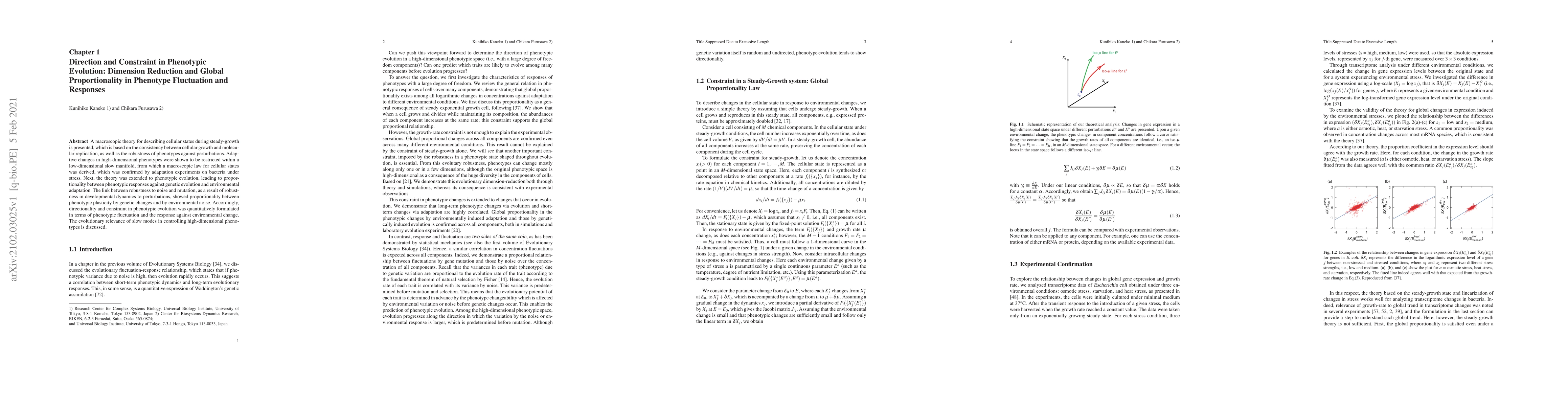 A macroscopic theory for describing cellular states during steady-growth is presented, which is based on the consistency between cellular growth and molecular replication, as well as the robustness of phenotypes against perturbations. Adaptive changes in high-dimensional phenotypes were shown to be restricted within a low-dimensional slow manifold, from which a macroscopic law for cellular states was derived, which was confirmed by adaptation experiments on bacteria under stress. Next, the theory was extended to phenotypic evolution, leading to proportionality between phenotypic responses against genetic evolution and environmental adaptation. The link between robustness to noise and mutation, as a result of robustness in developmental dynamics to perturbations, showed proportionality between phenotypic plasticity by genetic changes and by environmental noise. Accordingly, directionality and constraint in phenotypic evolution was quantitatively formulated in terms of phenotypic fluctuation and the response against environmental change. The evolutionary relevance of slow modes in controlling high-dimensional phenotypes is discussed.