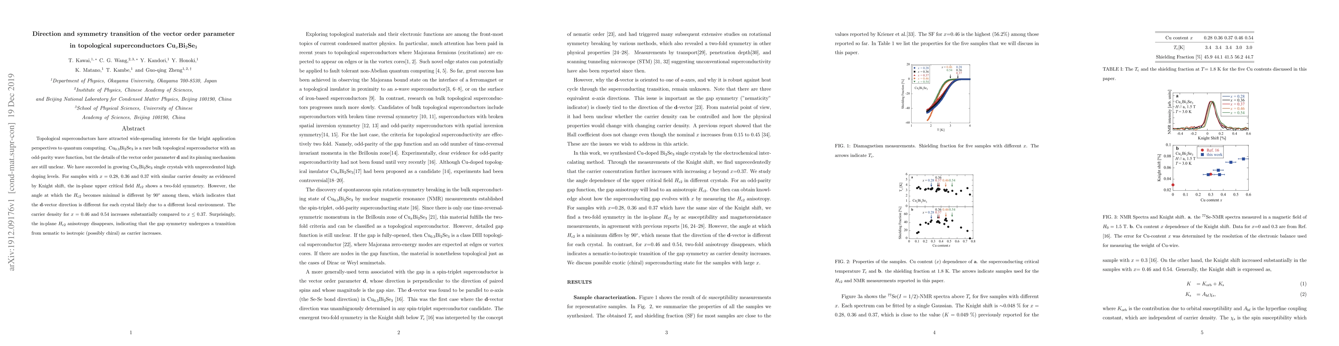 This paper investigates the vector order parameter $\textbf{{d}}$ in topological superconductors Cu$_x$Bi$_2$Se$_3$, revealing a transition in symmetry from nematic to isotropic with increasing carrier density. High doping levels in single crystals show a two-fold symmetry in the in-plane upper critical field $H_{\rm c2}$ for certain doping levels, indicating differing $\textbf{{d}}$-vector directions.