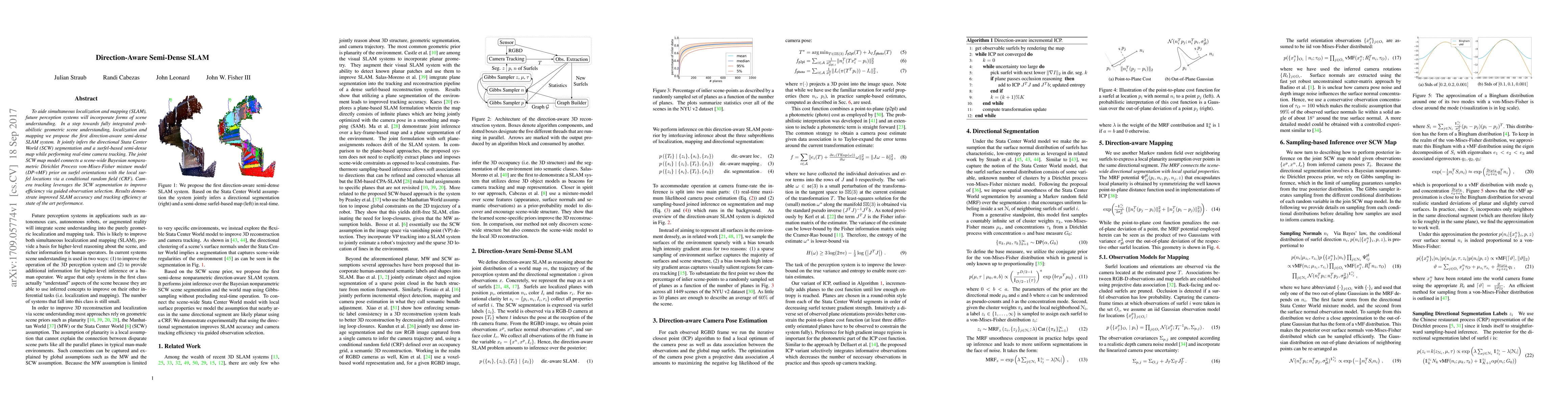 This paper proposes a direction-aware semi-dense SLAM system that jointly infers directional scene segmentation and a surfel-based map while performing real-time camera tracking, leveraging a Bayesian nonparametric prior and conditional random field for improved efficiency. The results show enhanced SLAM accuracy and tracking performance.