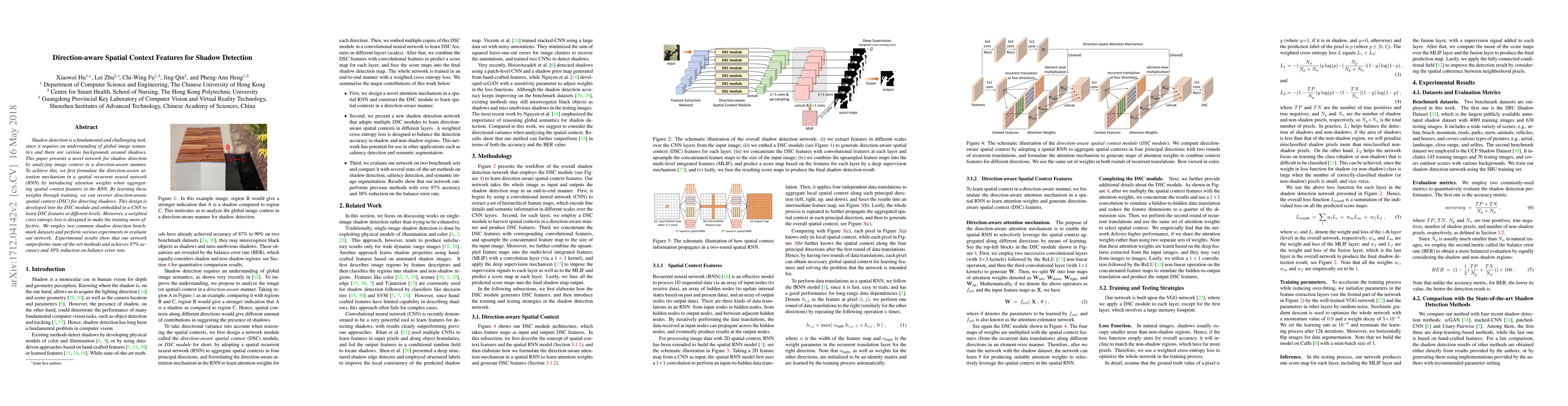 A new network for shadow detection uses direction-aware attention to analyze image context and outperforms state-of-the-art methods with 97% accuracy and 38% reduction in balance error rate.