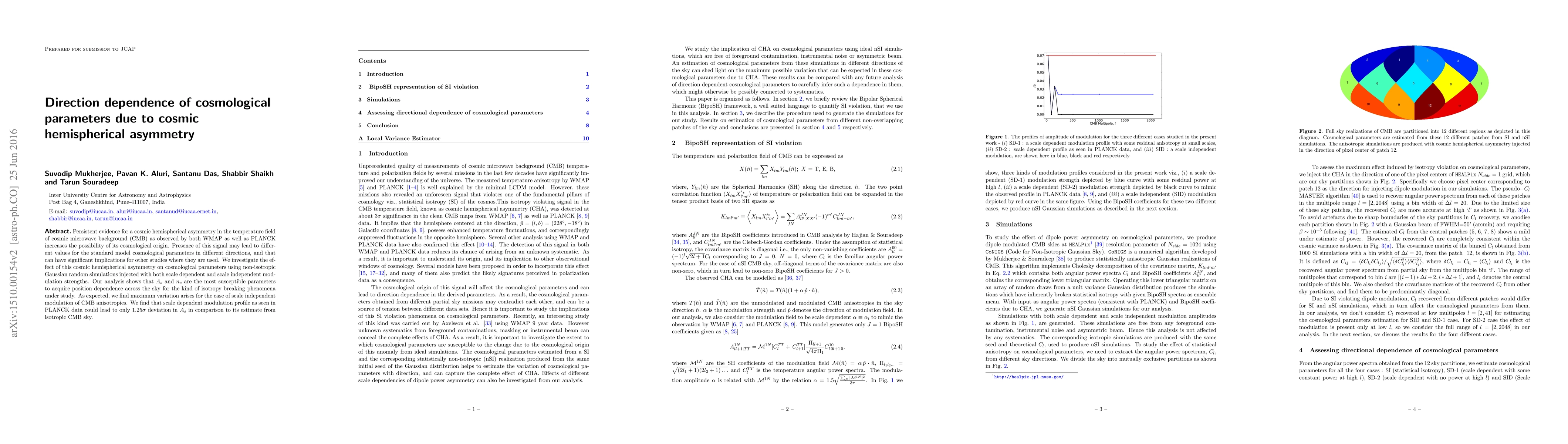 Persistent evidence for a cosmic hemispherical asymmetry in the temperature field of cosmic microwave background (CMB) as observed by both WMAP as well as PLANCK increases the possibility of its cosmological origin. Presence of this signal may lead to different values for the standard model cosmological parameters in different directions, and that can have significant implications for other studies where they are used. We investigate the effect of this cosmic hemispherical asymmetry on cosmological parameters using non-isotropic Gaussian random simulations injected with both scale dependent and scale independent modulation strengths. Our analysis shows that $A_s$ and $n_s$ are the most susceptible parameters to acquire position dependence across the sky for the kind of isotropy breaking phenomena under study. As expected, we find maximum variation arises for the case of scale independent modulation of CMB anisotropies. We find that scale dependent modulation profile as seen in PLANCK data could lead to only $1.25\sigma$ deviation in $A_s$ in comparison to its estimate from isotropic CMB sky.
