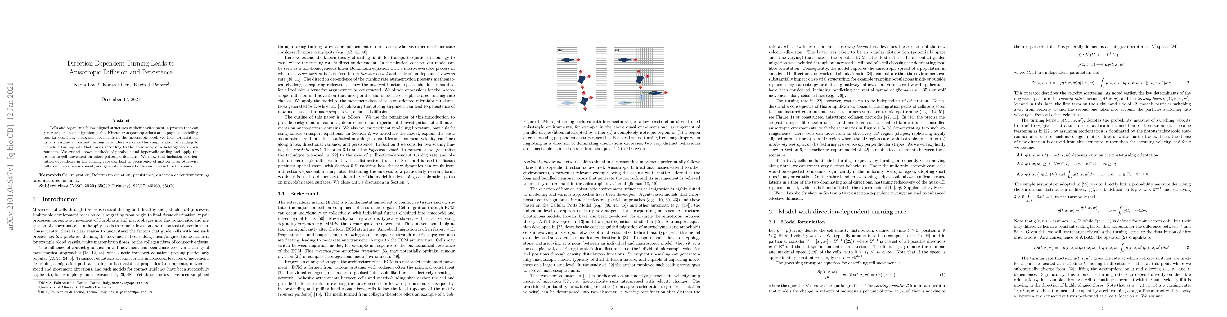 This research introduces a variation in turning rates based on environmental anisotropy in kinetic transport equations, modeling cell movement. It demonstrates that direction-dependent turning can cause persistent motion in symmetric environments and enhanced diffusion in structured domains.