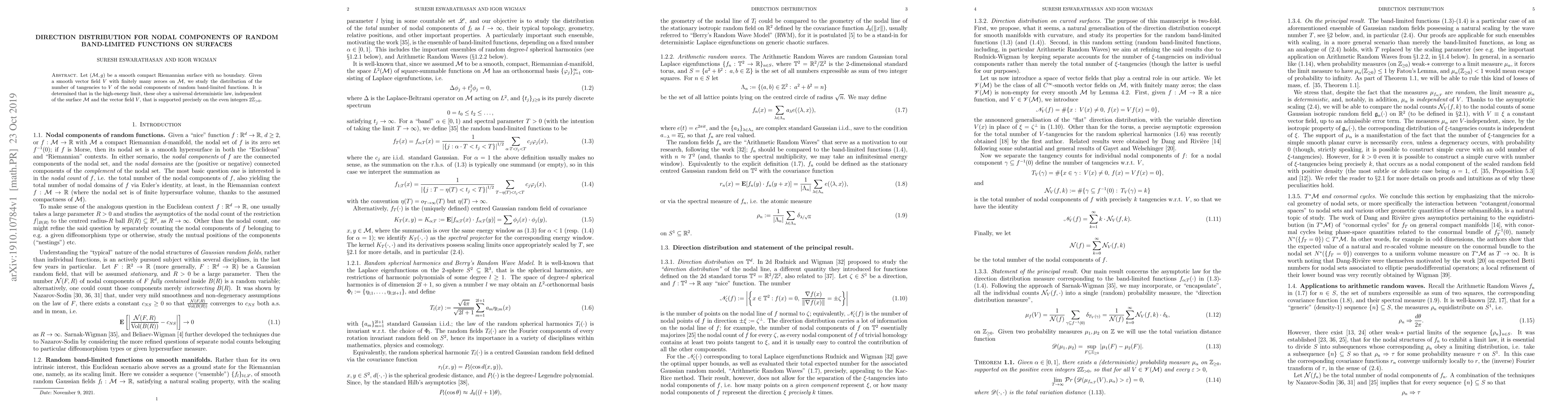 This paper investigates the distribution of tangencies between nodal components of random band-limited functions on a smooth compact Riemannian surface and a given smooth vector field. It finds that in the high-energy limit, the number of such tangencies follows a universal deterministic law, independent of the surface and vector field, restricted to even integers.