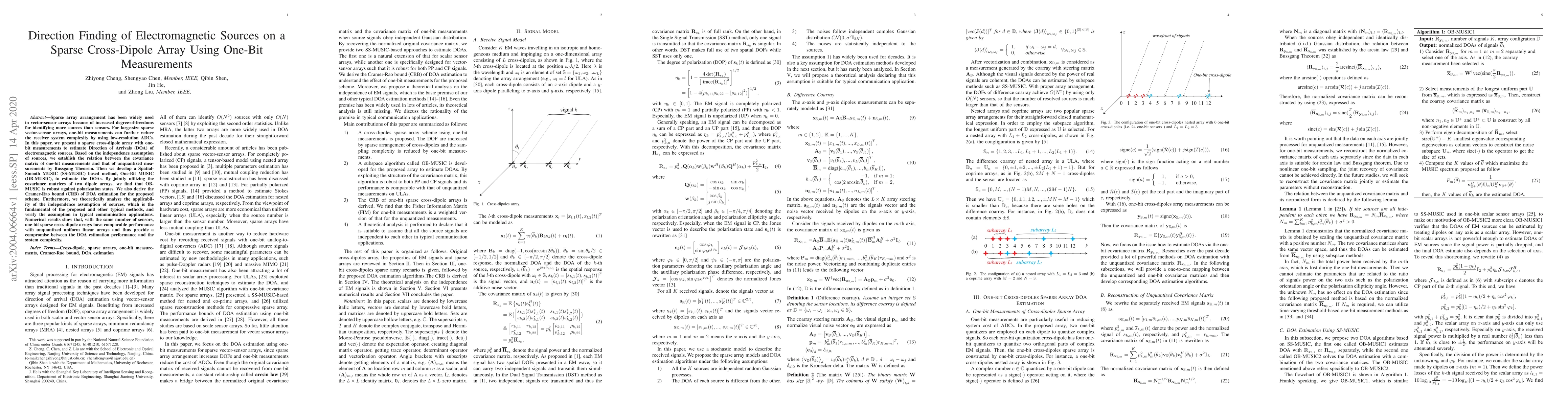 This paper proposes a sparse cross-dipole array with one-bit measurements for estimating Direction of Arrivals (DOA) of electromagnetic sources. It develops a One-Bit MUSIC (OB-MUSIC) method based on the independence assumption of sources and demonstrates its robustness against polarization states.