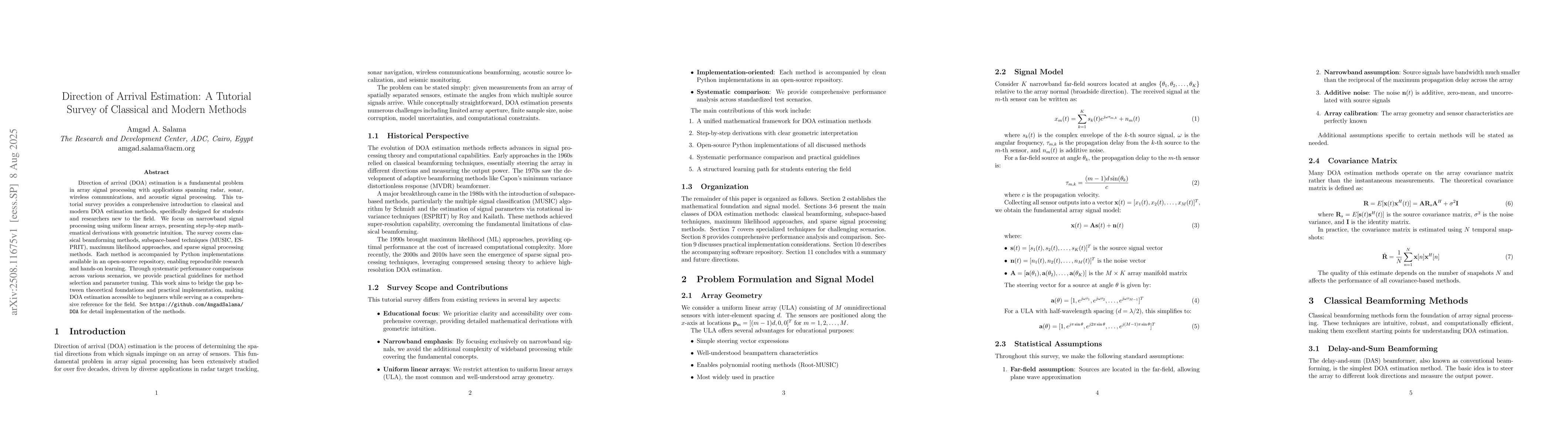 Direction of arrival (DOA) estimation is a fundamental problem in array signal processing with applications spanning radar, sonar, wireless communications, and acoustic signal processing. This tutorial survey provides a comprehensive introduction to classical and modern DOA estimation methods, specifically designed for students and researchers new to the field. We focus on narrowband signal processing using uniform linear arrays, presenting step-by-step mathematical derivations with geometric intuition. The survey covers classical beamforming methods, subspace-based techniques (MUSIC, ESPRIT), maximum likelihood approaches, and sparse signal processing methods. Each method is accompanied by Python implementations available in an open-source repository, enabling reproducible research and hands-on learning. Through systematic performance comparisons across various scenarios, we provide practical guidelines for method selection and parameter tuning. This work aims to bridge the gap between theoretical foundations and practical implementation, making DOA estimation accessible to beginners while serving as a comprehensive reference for the field. See https://github.com/AmgadSalama/DOA for detail implementation of the methods.