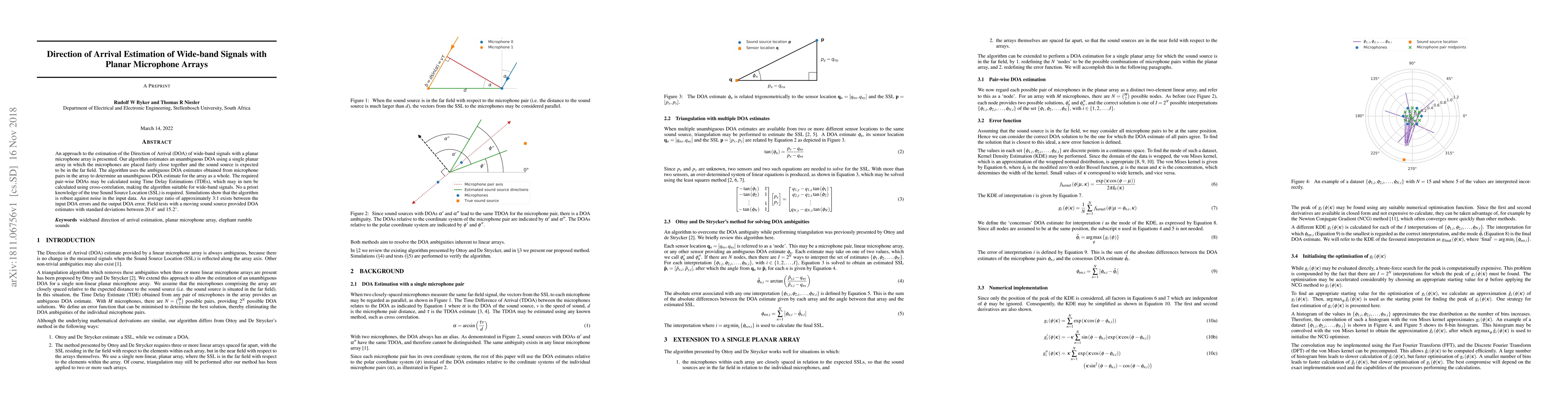 Researchers developed an algorithm to estimate the Direction of Arrival (DOA) of wide-band signals using a planar microphone array without prior knowledge of the sound source location. The algorithm achieved robust results in simulations and field tests with moving sound sources.