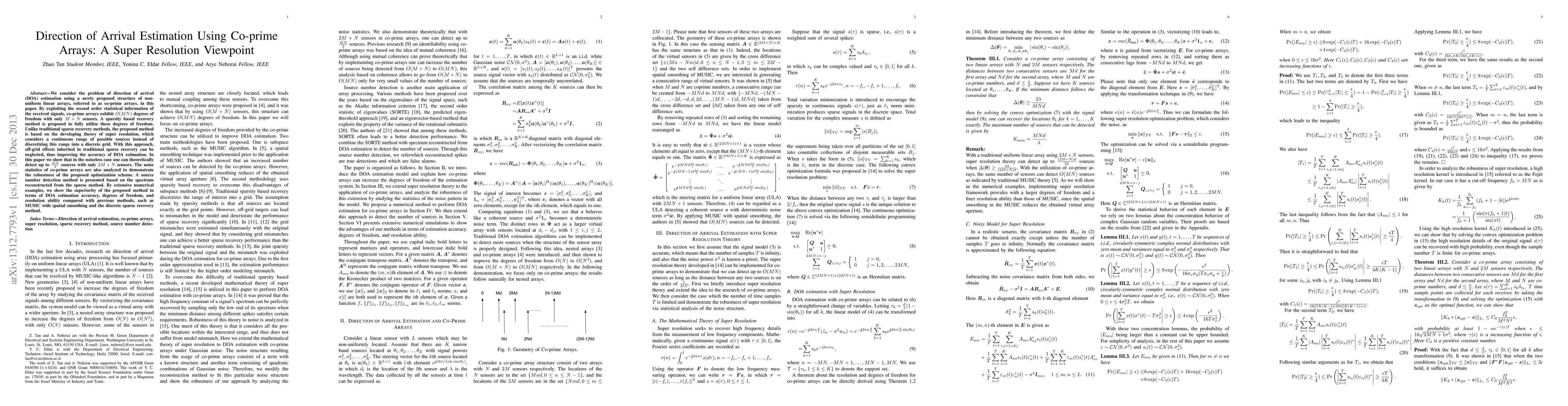This paper proposes a novel direction of arrival (DOA) estimation method using co-prime arrays, which leverages O(MN) degrees of freedom with only M + N sensors. It introduces a super-resolution based sparsity recovery technique that enhances accuracy by avoiding off-grid effects, demonstrating theoretical detection of up to M N sources with fewer sensors and showing superior performance over traditional methods.