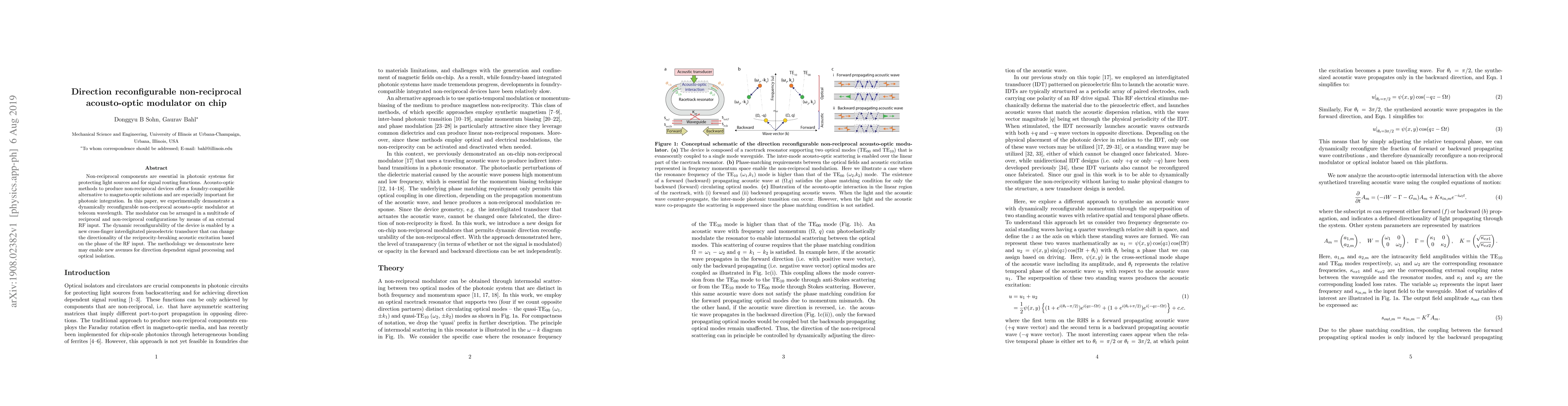 This paper demonstrates a dynamically reconfigurable non-reciprocal acousto-optic modulator using a novel cross-finger transducer, enabling various configurations via an external RF input for direction-dependent signal processing and optical isolation. The technique offers a foundry-compatible alternative to magneto-optic solutions.