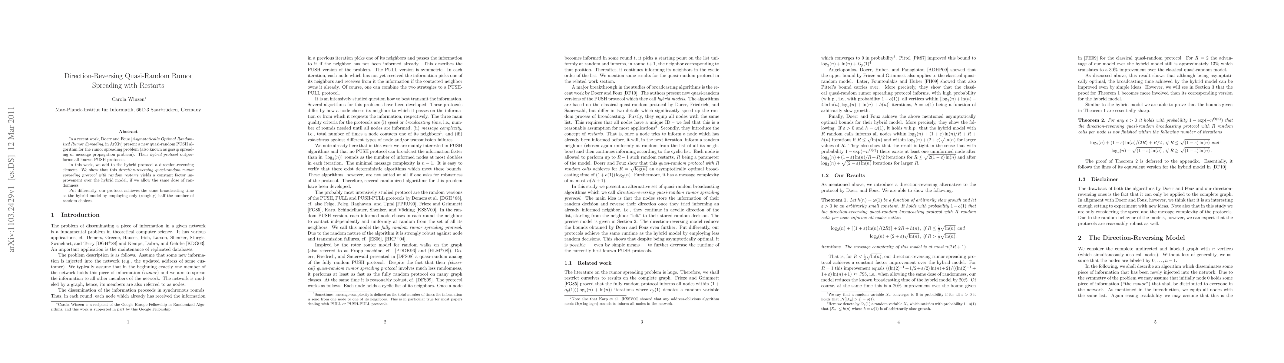 In a recent work, Doerr and Fouz [\emph{Asymptotically Optimal Randomized Rumor Spreading}, in ArXiv] present a new quasi-random PUSH algorithm for the rumor spreading problem (also known as gossip spreading or message propagation problem). Their \emph{hybrid protocol} outperforms all known PUSH protocols. In this work, we add to the hybrid protocol a direction-reversing element. We show that this \emph{direction-reversing quasi-random rumor spreading protocol with random restarts} yields a constant factor improvement over the hybrid model, if we allow the same dose of randomness. Put differently, our protocol achieves the same broadcasting time as the hybrid model by employing only (roughly) half the number of random choices.