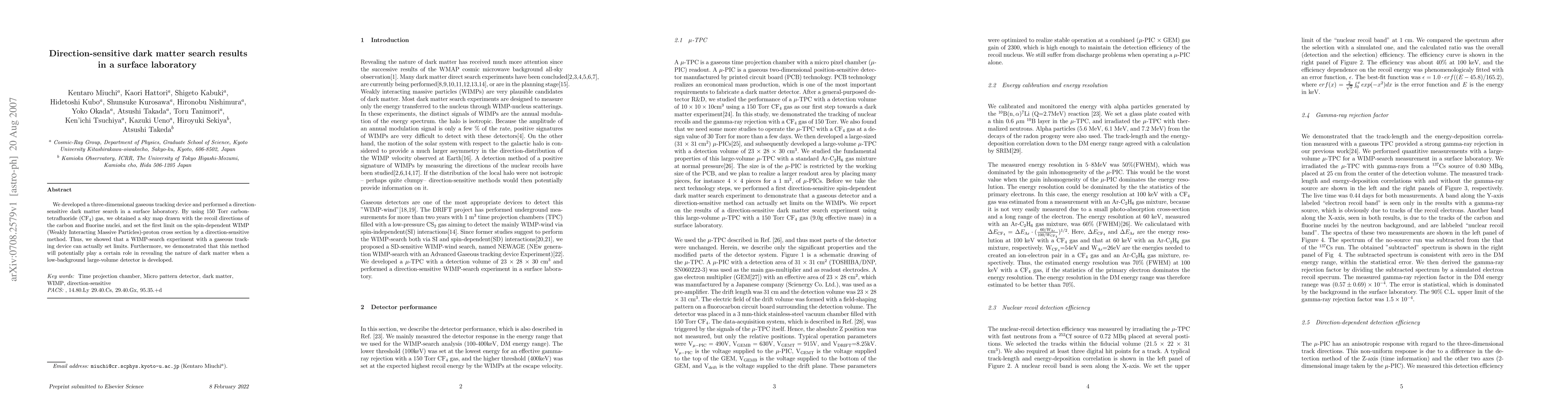 We developed a three-dimensional gaseous tracking device and performed a direction-sensitive dark matter search in a surface laboratory. By using 150 Torr carbon-tetrafluoride (CF_4 gas), we obtained a sky map drawn with the recoil directions of the carbon and fluorine nuclei, and set the first limit on the spin-dependent WIMP (Weakly Interacting Massive Particles)-proton cross section by a direction-sensitive method. Thus, we showed that a WIMP-search experiment with a gaseous tracking device can actually set limits. Furthermore, we demonstrated that this method will potentially play a certain role in revealing the nature of dark matter when a low-background large-volume detector is developed.