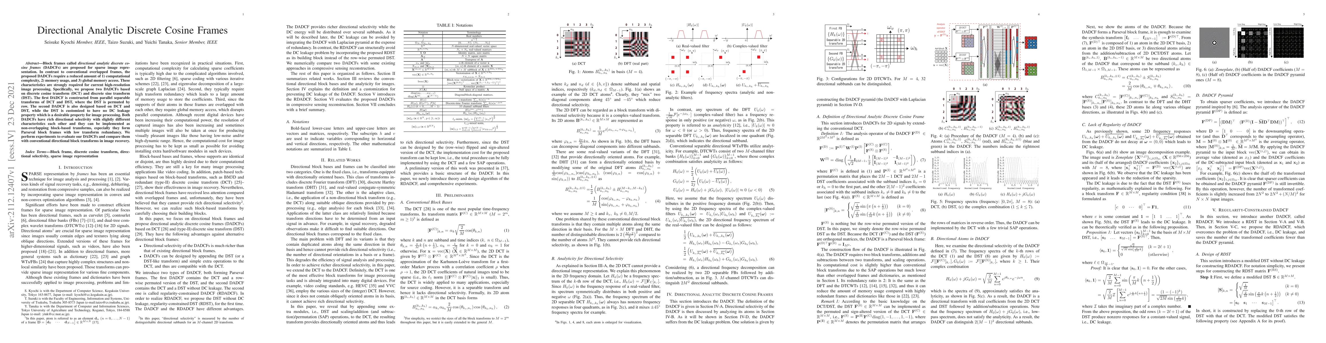 This paper proposes directional analytic discrete cosine frames (DADCFs) for efficient sparse image representation, offering reduced computational complexity, memory usage, and global memory access. Two DADCFs are introduced based on DCT and DST, with one having no DC leakage property, both providing rich directional selectivity and low transform redundancy. Experiments show their effectiveness in image recovery compared to conventional transforms.
