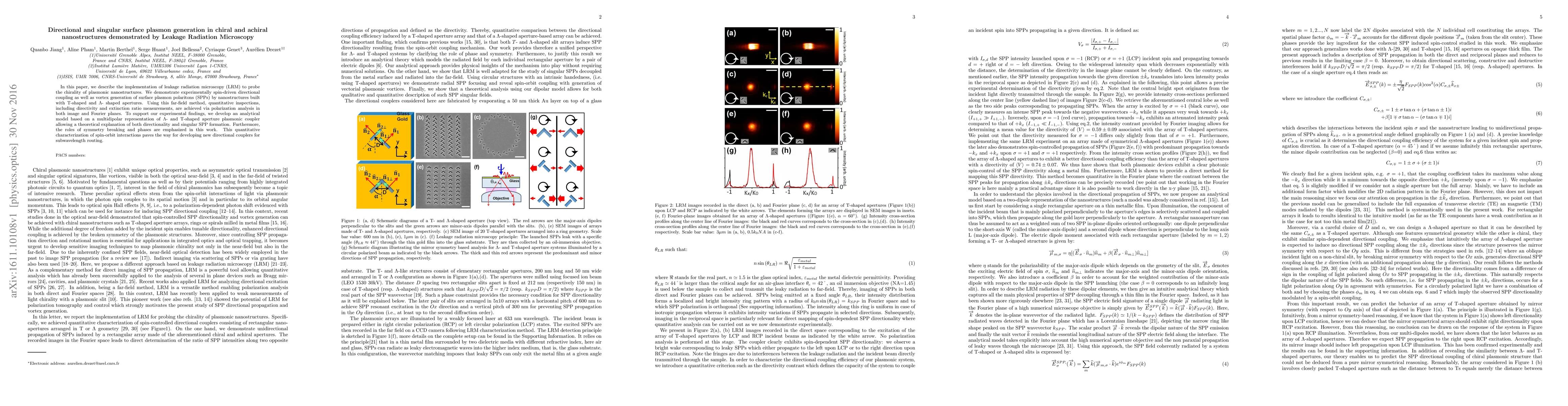 In this paper, we describe the implementation of leakage radiation microscopy (LRM) to probe the chirality of plasmonic nanostructures. We demonstrate experimentally spin-driven directional coupling as well as vortex generation of surface plasmon polaritons (SPPs) by nanostructures built with T-shaped and $\Lambda$- shaped apertures. Using this far-field method, quantitative inspections, including directivity and extinction ratio measurements, are achieved via polarization analysis in both image and Fourier planes. To support our experimental findings, we develop an analytical model based on a multidipolar representation of $\Lambda$- and T-shaped aperture plasmonic coupler allowing a theoretical explanation of both directionality and singular SPP formation. Furthermore, the roles of symmetry breaking and phases are emphasized in this work. This quantitative characterization of spin-orbit interactions paves the way for developing new directional couplers for subwavelength routing.