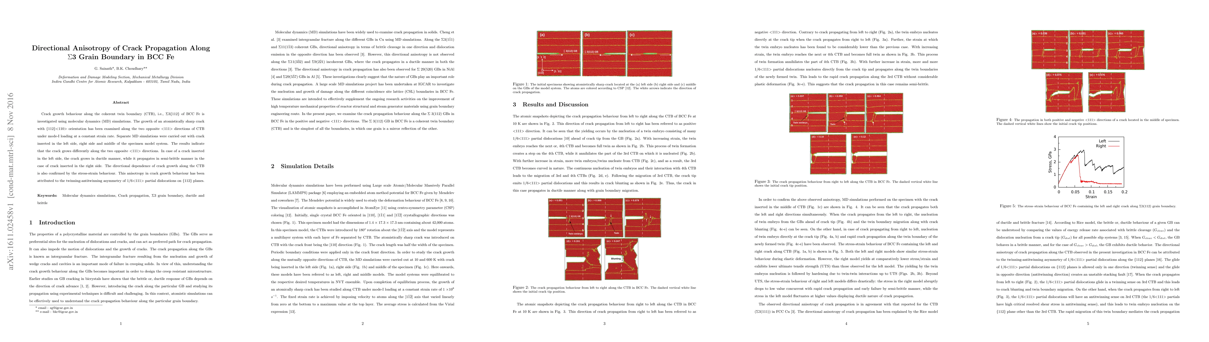 This study investigates the directional anisotropy of crack propagation along the $\Sigma$3 grain boundary in BCC Fe using molecular dynamics simulations. The results show different crack growth behaviors depending on the crack's initial position, with ductile growth on the left and semi-brittle on the right, attributed to twinning-antitwinning asymmetry of partial dislocations.