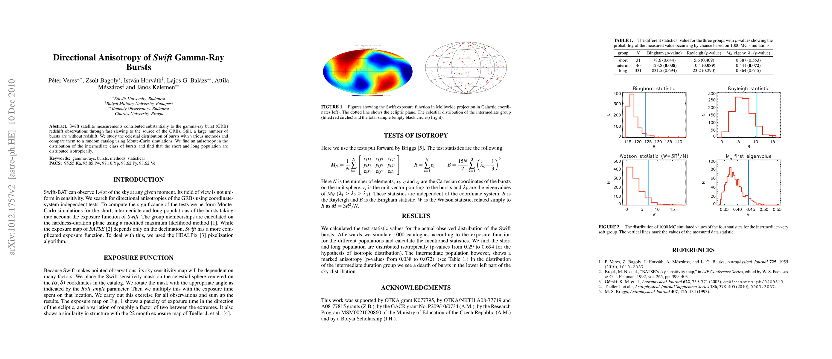 Swift satellite data reveals anisotropy in the distribution of intermediate gamma-ray bursts, while short and long bursts show isotropic distribution, according to Monte-Carlo simulations comparing observed bursts to random catalogs.
