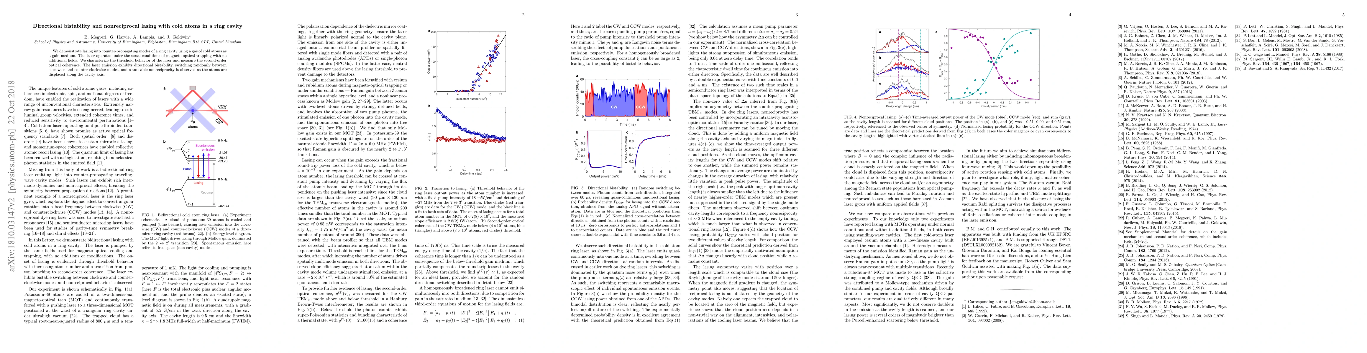 This paper demonstrates lasing in a ring cavity using cold atoms as a gain medium, showing directional bistability and tunable nonreciprocity. The laser switches between clockwise and counter-clockwise modes and exhibits unique optical coherence properties.