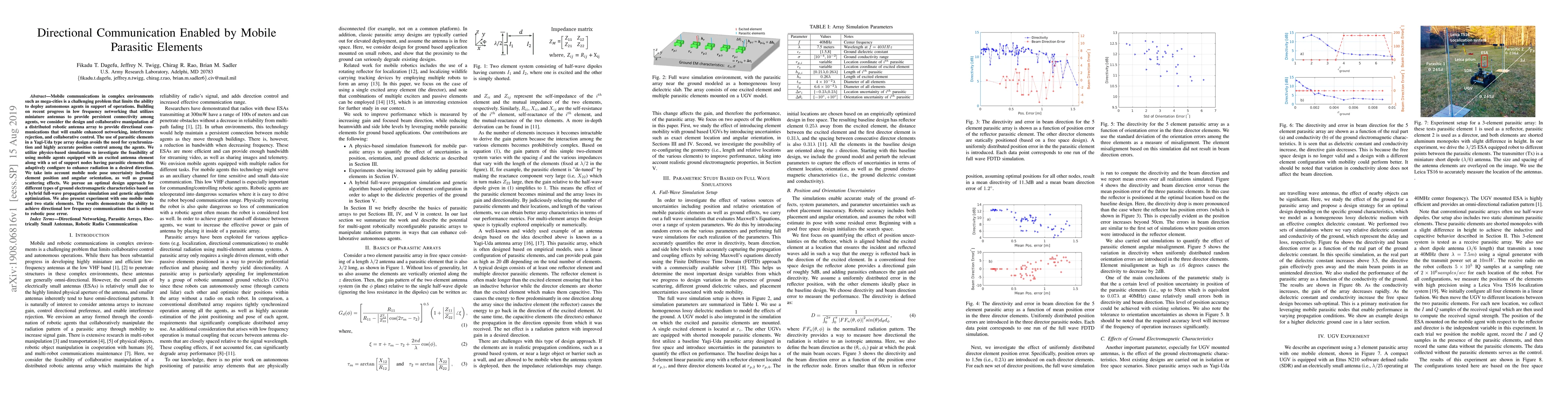 Mobile communications in complex environments such as mega-cities is a challenging problem that limits the ability to deploy autonomous agents in support of operations. Building on recent progress in low frequency networking that utilizes miniature antennas to provide persistent connectivity among agents, we consider the design and collaborative manipulation of a distributed robotic antenna array to provide directional communications that will enable enhanced networking, interference rejection, and collaborative control. The use of parasitic elements in a Yagi-Uda type array design avoids the need for synchronization and highly accurate position control among the agents. We utilize physics-based simulations to investigate the feasibility of using mobile agents equipped with an excited antenna element along with a set of support nodes having parasitic elements that adaptively configure to enhance radiation in a desired direction. We take into account mobile node pose uncertainty including element position and angular orientation, as well as ground scattering effects. We pursue an optimal design approach for different types of ground electromagnetic characteristics based on a hybrid full-wave propagation simulation and genetic algorithm optimization. We also present experiment with one mobile node and two static elements. The results demonstrate the ability to achieve directional low frequency communications that is robust to robotic pose error.