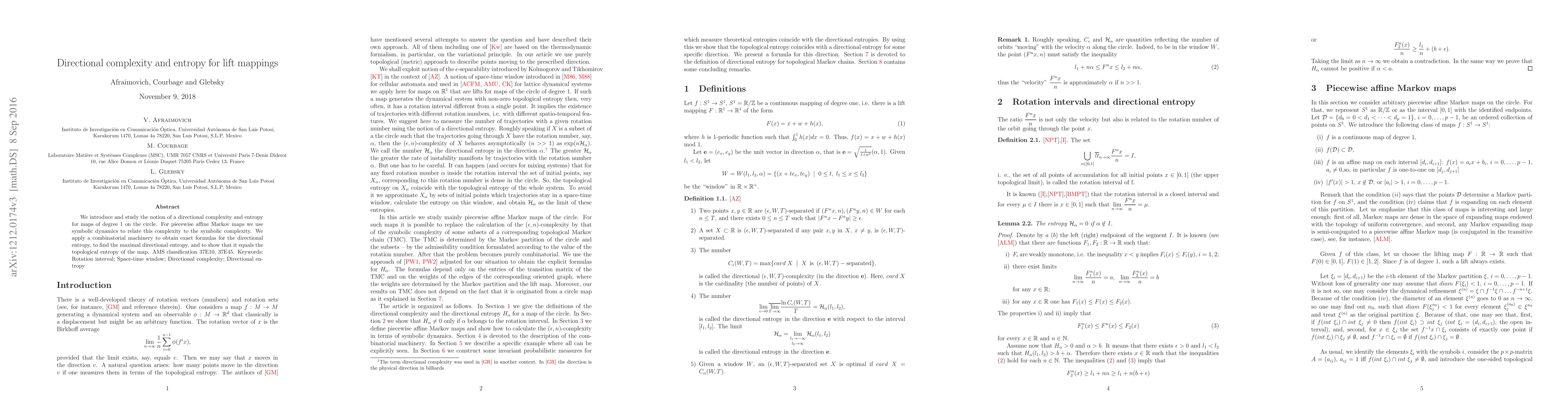 This paper introduces directional complexity and entropy for degree 1 maps on the circle, relating it to symbolic complexity for piecewise affine Markov maps. It uses combinatorial methods to derive exact formulas for directional entropy, showing it equals the topological entropy.