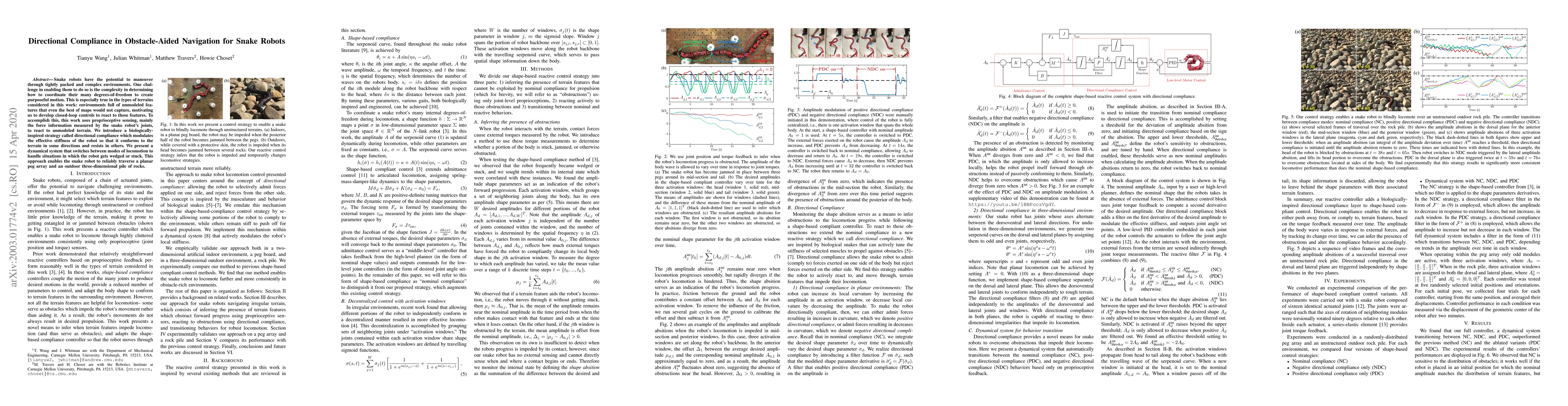 Snake robots can navigate complex environments using directional compliance, a biologically-inspired strategy that modulates stiffness to conform to terrain in some directions and resist in others.
