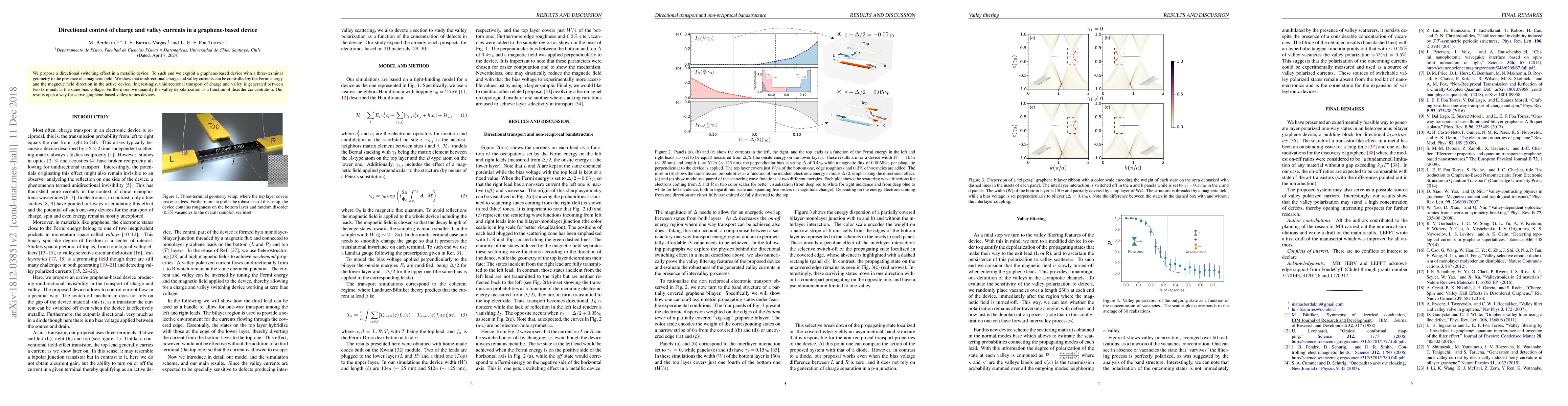 This paper proposes a graphene-based three-terminal device that can control unidirectional charge and valley currents through manipulation of the Fermi energy and magnetic field direction. The study also quantifies valley depolarization with disorder concentration, paving the way for advanced graphene-based valleytronics.