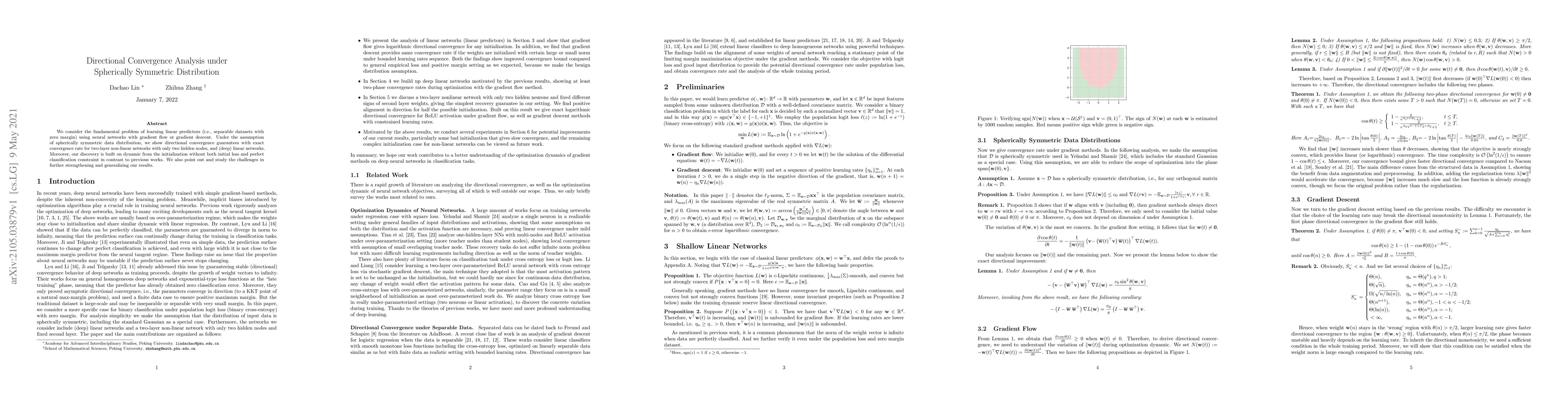 This paper investigates learning linear predictors using neural networks under spherically symmetric data distribution, demonstrating directional convergence guarantees and exact convergence rates for two-layer networks with minimal hidden nodes and deep linear networks. Unlike previous studies, the analysis does not require initial loss or perfect classification constraints.