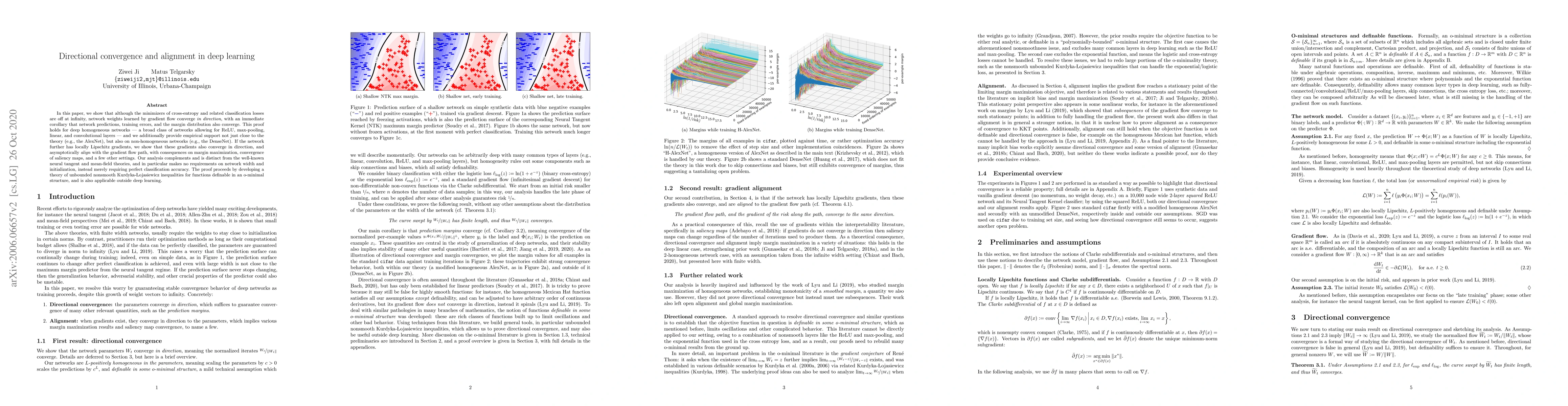 In this paper, we show that although the minimizers of cross-entropy and related classification losses are off at infinity, network weights learned by gradient flow converge in direction, with an immediate corollary that network predictions, training errors, and the margin distribution also converge. This proof holds for deep homogeneous networks -- a broad class of networks allowing for ReLU, max-pooling, linear, and convolutional layers -- and we additionally provide empirical support not just close to the theory (e.g., the AlexNet), but also on non-homogeneous networks (e.g., the DenseNet). If the network further has locally Lipschitz gradients, we show that these gradients also converge in direction, and asymptotically align with the gradient flow path, with consequences on margin maximization, convergence of saliency maps, and a few other settings. Our analysis complements and is distinct from the well-known neural tangent and mean-field theories, and in particular makes no requirements on network width and initialization, instead merely requiring perfect classification accuracy. The proof proceeds by developing a theory of unbounded nonsmooth Kurdyka-{\L}ojasiewicz inequalities for functions definable in an o-minimal structure, and is also applicable outside deep learning.