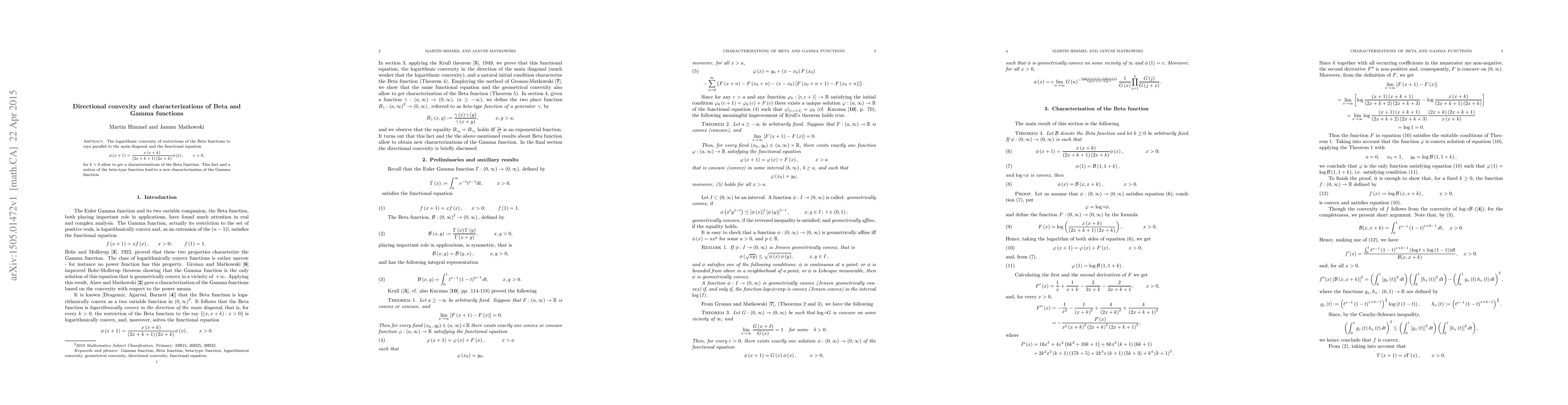 The Beta function is characterized using directional convexity and a functional equation, leading to a new characterization of the Gamma function.