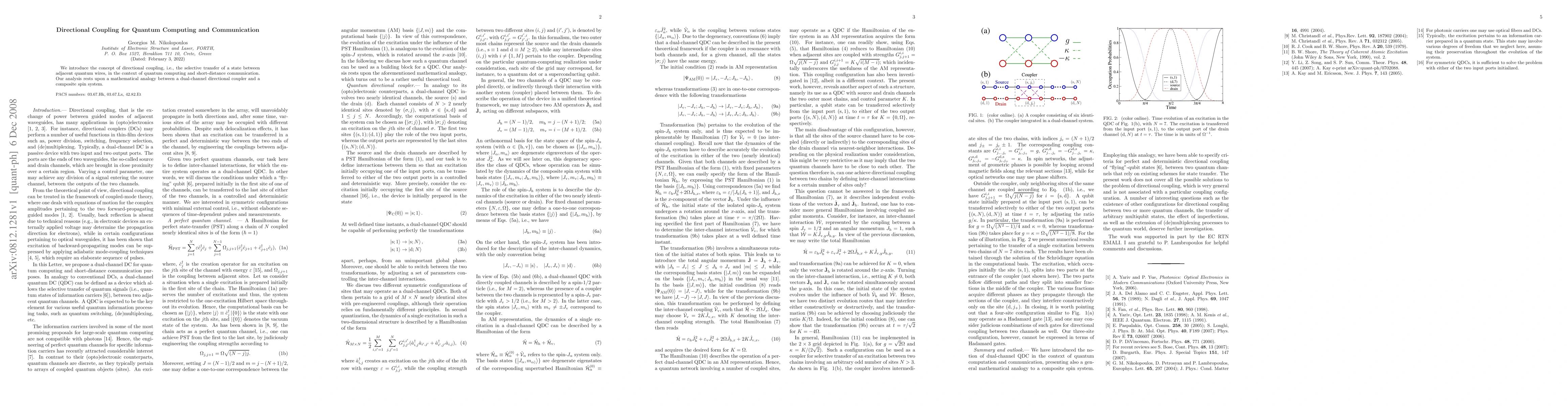 We introduce the concept of directional coupling, i.e., the selective transfer of a state between adjacent quantum wires, in the context of quantum computing and short-distance communication. Our analysis rests upon a mathematical analogy between a dual-channel directional coupler and a composite spin system.