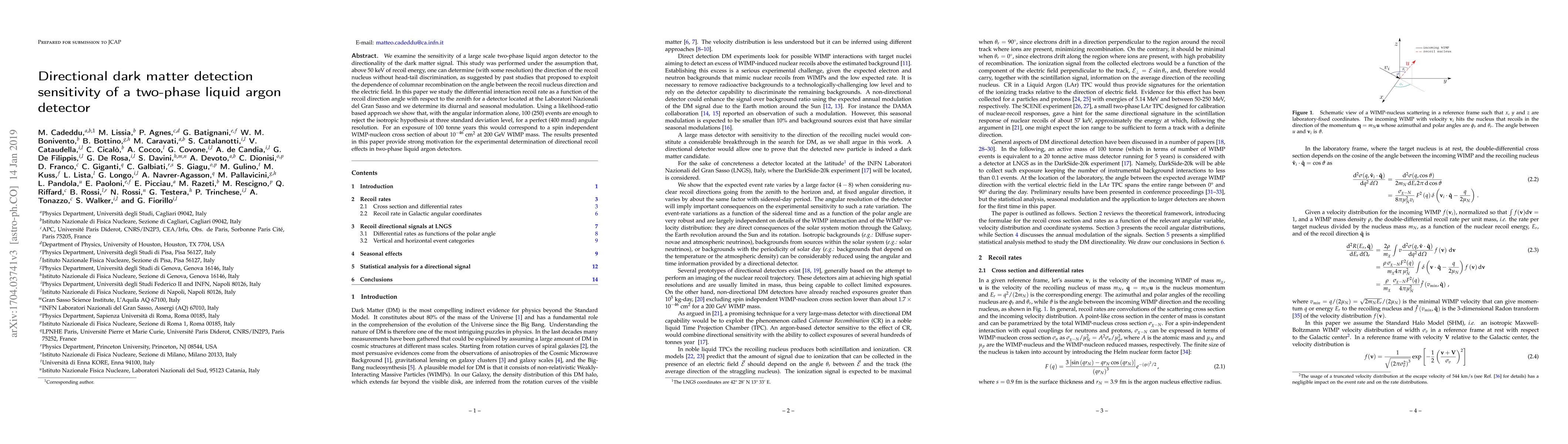 We examine the sensitivity of a large scale two-phase liquid argon detector to the directionality of the dark matter signal. This study was performed under the assumption that, above 50 keV of recoil energy, one can determine (with some resolution) the direction of the recoil nucleus without head-tail discrimination, as suggested by past studies that proposed to exploit the dependence of columnar recombination on the angle between the recoil nucleus direction and the electric field. In this paper we study the differential interaction recoil rate as a function of the recoil direction angle with respect to the zenith for a detector located at the Laboratori Nazionali del Gran Sasso and we determine its diurnal and seasonal modulation. Using a likelihood-ratio based approach we show that, with the angular information alone, 100 events are enough to reject the isotropic hypothesis at three standard deviation level. For an exposure of 100 tonne years this would correspond to a spin independent WIMP-nucleon cross section of about 10^-46 cm^2 at 200 GeV WIMP mass. The results presented in this paper provide strong motivation for the experimental determination of directional recoil effects in two-phase liquid argon detectors.