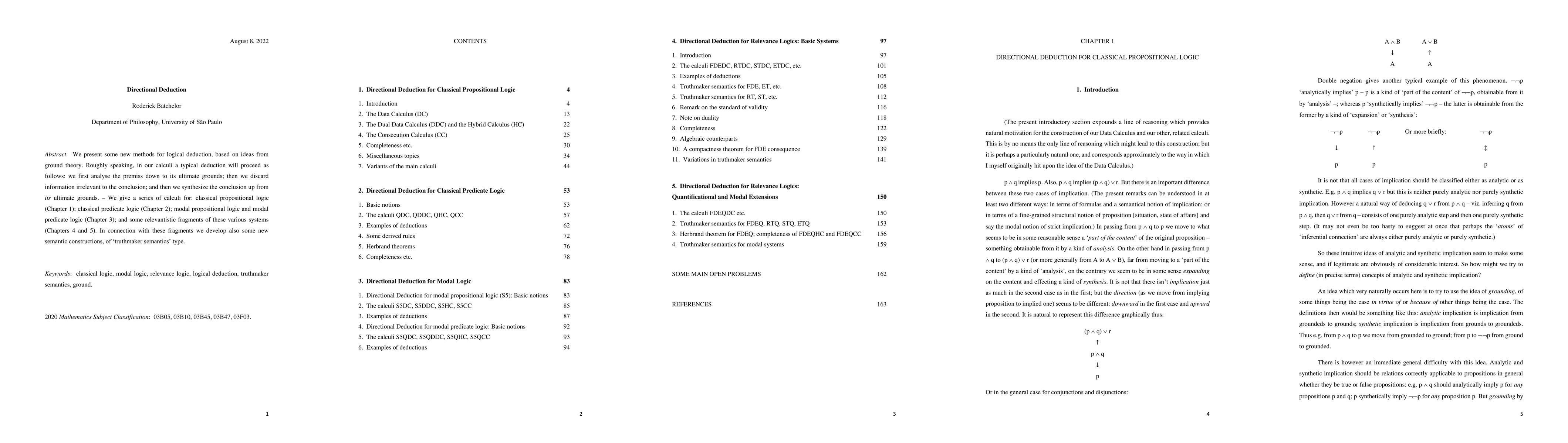 We present some new methods for logical deduction, based on ideas from ground theory. Roughly speaking, in our calculi a typical deduction will proceed as follows: we first analyse the premiss down to its ultimate grounds; then we discard information irrelevant to the conclusion; and then we synthesize the conclusion up from its ultimate grounds. We give a series of calculi for: classical propositional logic (Chapter 1); classical predicate logic (Chapter 2); modal propositional logic and modal predicate logic (Chapter 3); and some relevantistic fragments of these various systems (Chapters 4 and 5). In connection with these fragments we develop also some new semantic constructions, of 'truthmaker semantics' type.