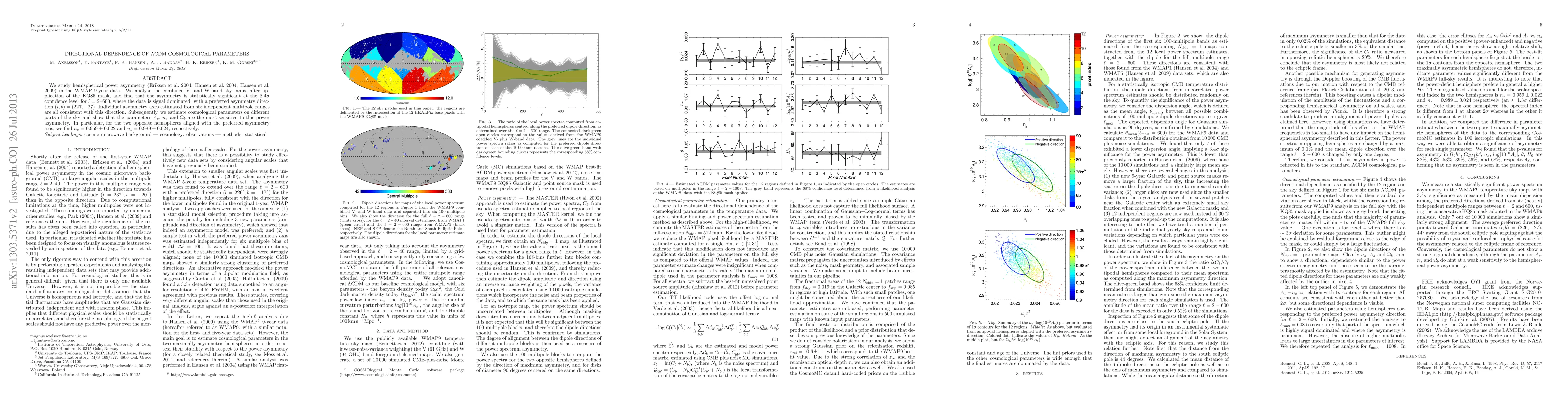 We study hemispherical power asymmetry (Eriksen et. al. 2004, Hansen et. al. 2004, Hansen et. al. 2009) in the WMAP 9-year data. We analyse the combined V- and W-band sky maps, after application of the KQ85 mask, and find that the asymmetry is statistically significant at the 3.4sigma confidence level for ell=2-600, where the data is signal dominated, with a preferred asymmetry direction (l,b)=(227,-27). Individual asymmetry axes estimated from six independent multipole ranges are all consistent with this direction. Subsequently, we estimate cosmological parameters on different parts of the sky and show that the parameters A_s, n_s and Omega_b are the most sensitive to this power asymmetry. In particular, for the two opposite hemispheres aligned with the preferred asymmetry axis, we find n_s = 0.959 \pm 0.022 and n_s = 0.989 \pm 0.024, respectively.