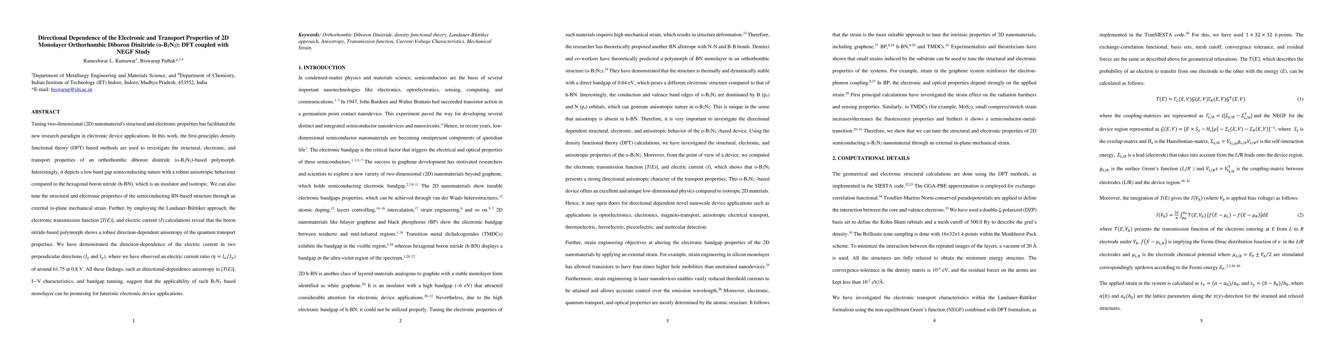 Tuning two dimensional nanomaterial's structural and electronic properties has facilitated the new research paradigm in electronic device applications. In this work, the first principles density functional theory based methods are used to investigate the structural, electronic, and transport properties of an orthorhombic diboron dinitride based polymorph. Interestingly, it depicts a low band gap semiconducting nature with a robust anisotropic behaviour compared to the hexagonal boron nitride, which is an insulator and isotropic. We can also tune the structural and electronic properties of the semiconducting B2N2 based structure through an external inplane mechanical strain. Further, by employing the Landauer Buttiker approach, the electronic transmission function, and electric current calculations reveal that the diboron dinitride based polymorph shows a robust direction dependent anisotropy of the quantum transport properties. We have demonstrated the direction dependence of the electric current in two perpendicular directions, where we have observed an electric current ratio of around 61.75 at 0.8 V. All these findings, such as directional dependence anisotropy in transmission function, current voltage characteristics, and bandgap tunning, suggest that the applicability of such B2N2 based monolayer can be promising for futuristic electronic device applications.