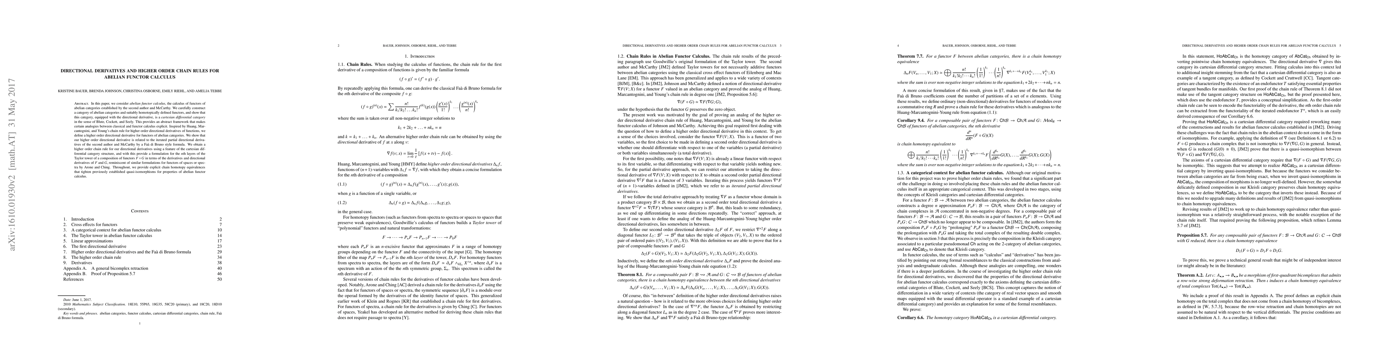 In this paper, we consider abelian functor calculus, the calculus of functors of abelian categories established by the second author and McCarthy. We carefully construct a category of abelian categories and suitably homotopically defined functors, and show that this category, equipped with the directional derivative, is a cartesian differential category in the sense of Blute, Cockett, and Seely. This provides an abstract framework that makes certain analogies between classical and functor calculus explicit. Inspired by Huang, Marcantognini, and Young's chain rule for higher order directional derivatives of functions, we define a higher order directional derivative for functors of abelian categories. We show that our higher order directional derivative is related to the iterated partial directional derivatives of the second author and McCarthy by a Fa\`a di Bruno style formula. We obtain a higher order chain rule for our directional derivatives using a feature of the cartesian differential category structure, and with this provide a formulation for the $n$th layers of the Taylor tower of a composition of functors $F\circ G$ in terms of the derivatives and directional derivatives of $F$ and $G$, reminiscent of similar formulations for functors of spaces or spectra by Arone and Ching. Throughout, we provide explicit chain homotopy equivalences that tighten previously established quasi-isomorphisms for properties of abelian functor calculus.